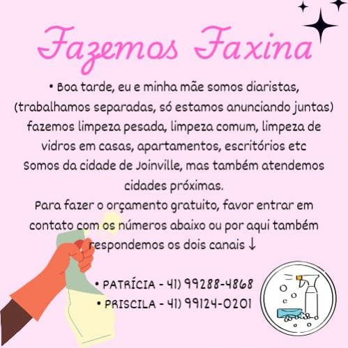 • Boa tarde, eu e minha filha somos diaristas, (trabalhamos separadas, e juntas também se o cliente precisar de 2 diaristas na mesma limpeza.