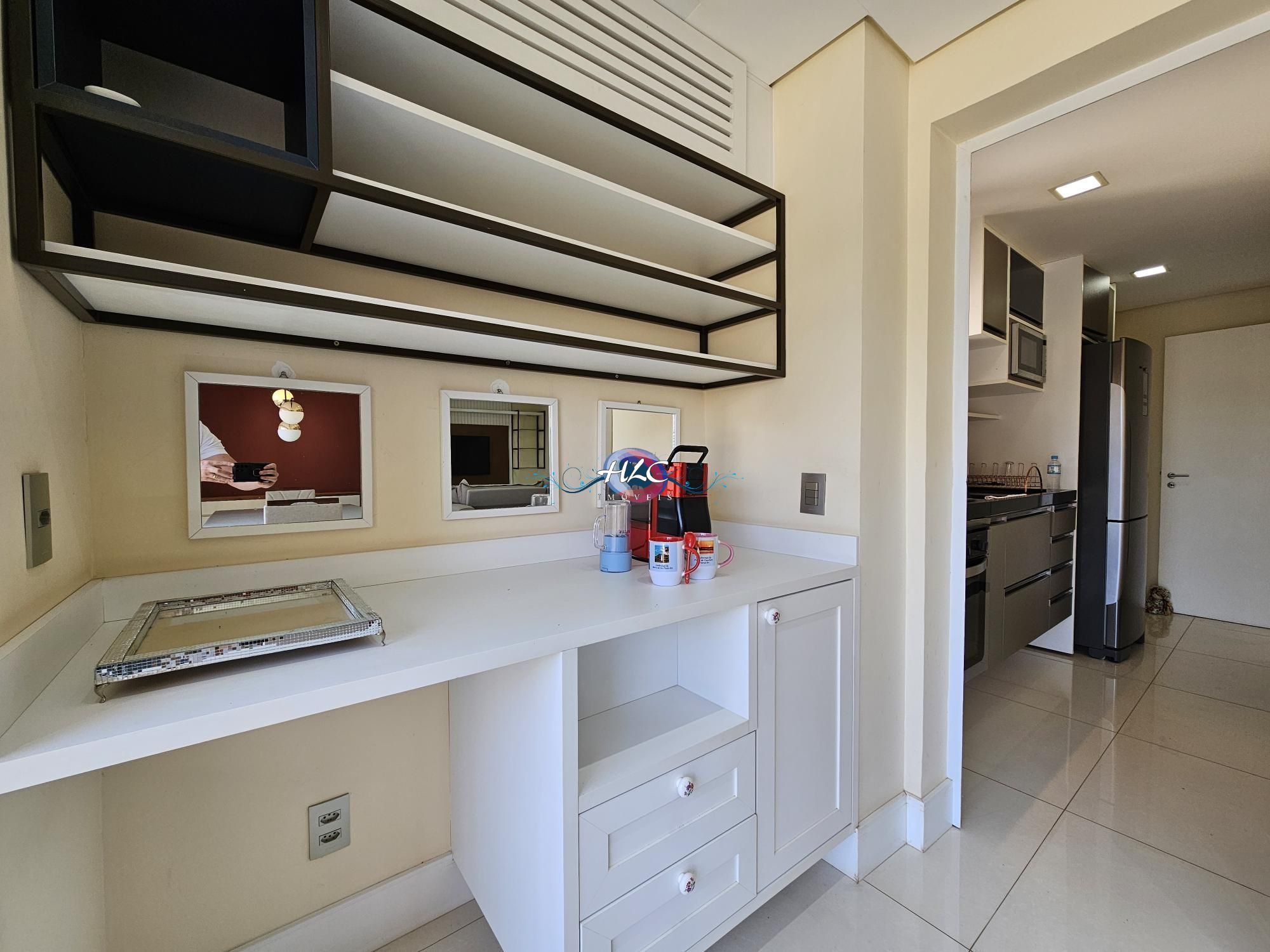 A cozinha é completa e funcional, ao lado da lavanderia e de uma despensa, garantindo total praticidade. Para quem precisa de um espaço para trabalhar, a unidade conta com um pequeno escritório. O conforto térmico é garantido pelo ar condicionado em todos os ambientes.