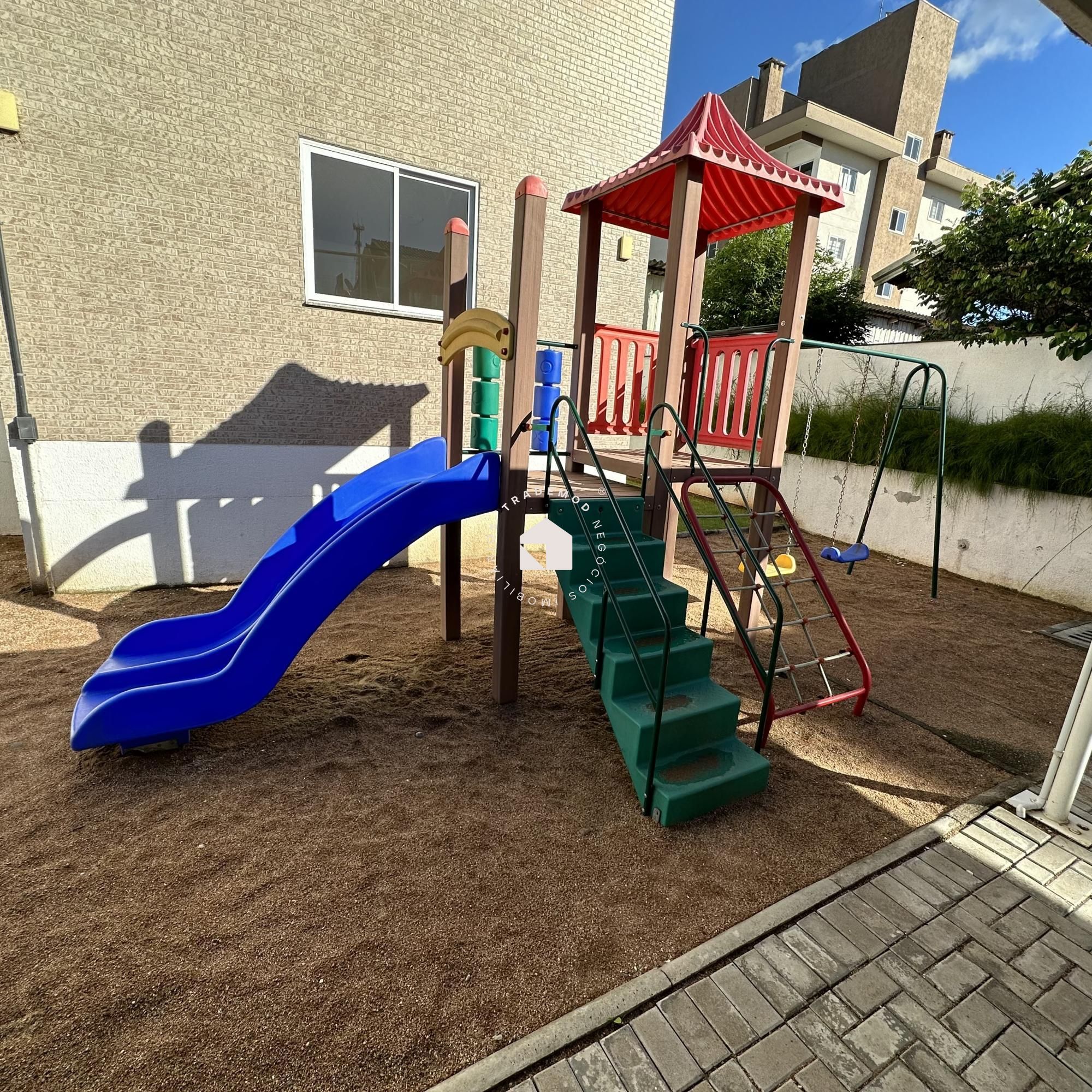 Estrutura de lazer com playground, piscina e salão de festas com 2 ambientes.