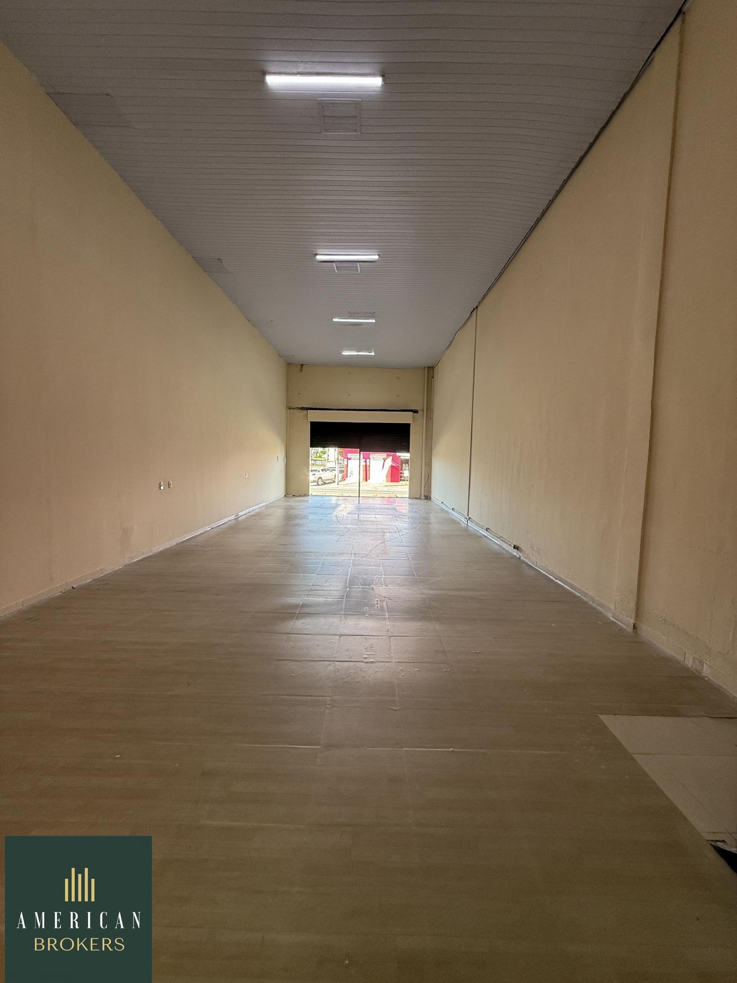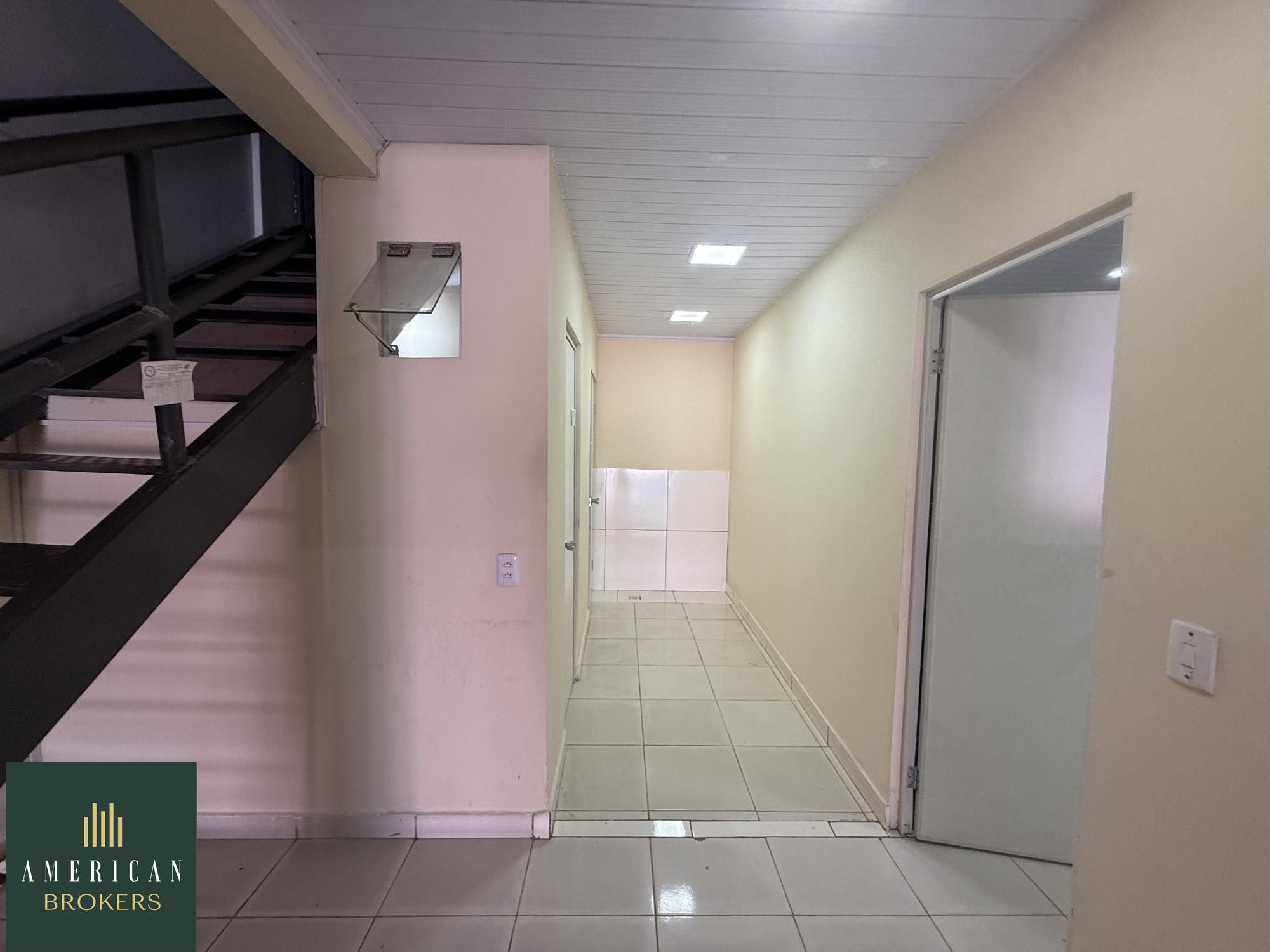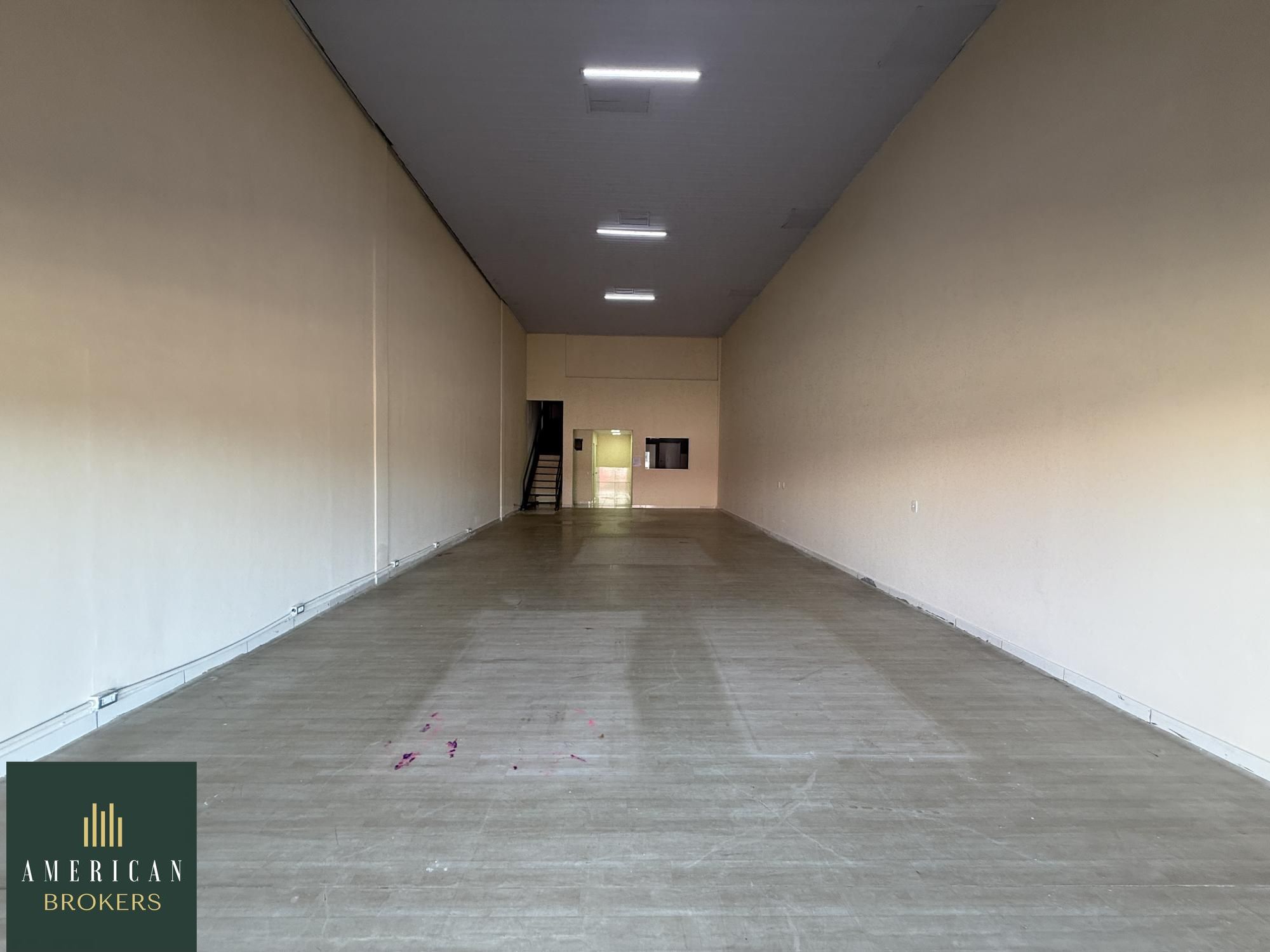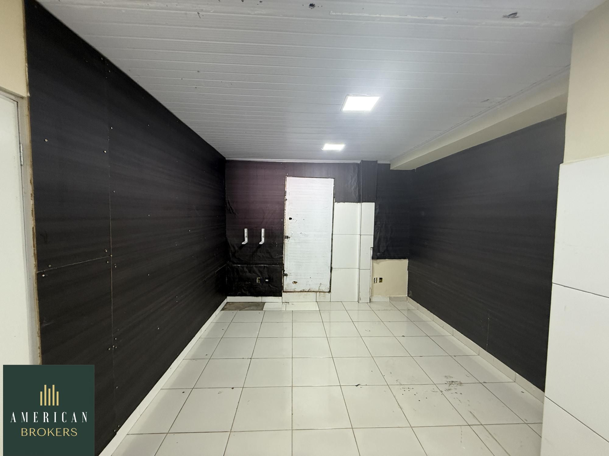 Sala com 132 m² um salão com vão livre, uma sala, 2 banheiros sendo 1 PNE, outra sala com bahias para cachorros, sendo 1 PNE, mezanino com 55 m² com um total de área construída de 187 m² , uma porta de ferro dupla.