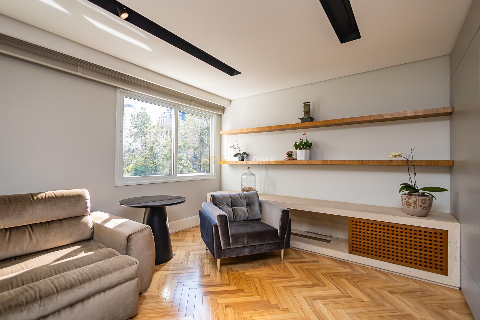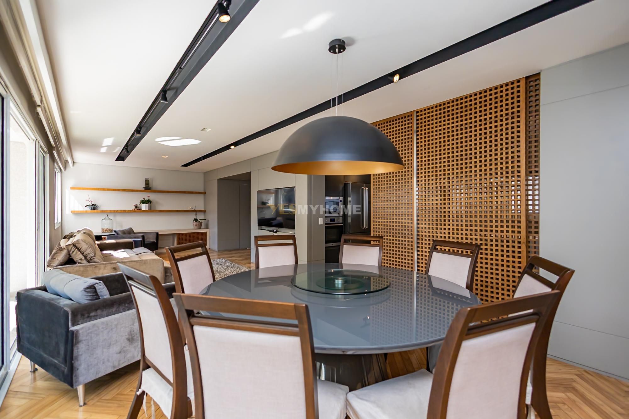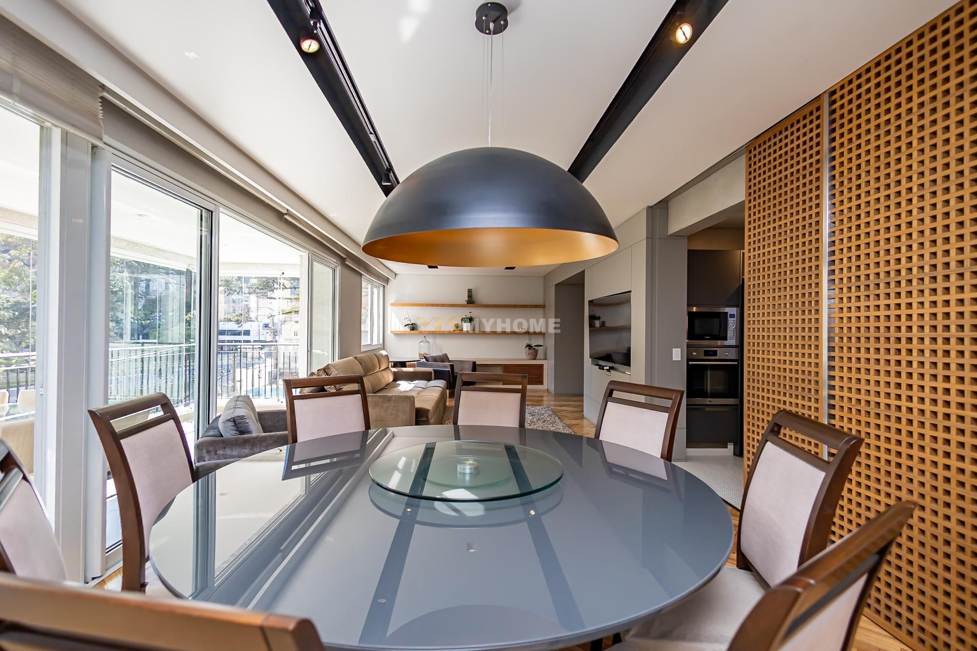 4 dormitórios, sendo 2 suítes e 2 demi-suites, (1 quarto que está sendo utilizado de escritório); 5 banheiros com acabamentos de alto padrão; Piso aquecido em todos os banheiros; Chuveiro duplo e pia dupla no banheiro da suíte master; Sala ampla com integração entre estar, jantar e cozinha americana; Sistema de iluminação com controle remoto; Cozinha ampla com electrodomésticos embutidos; Churrasqueira a carvão; Lareira na sala; Persianas automatizadas nos quartos e na sala; Banheiro social na entrada; Um lavabo na área de serviço; Varanda em vidro sistema Heik, com vista panorâmica para a praça ; Depósito espaçoso no subsolo; Gás individual; Ar-condicionado; Armários embutidos e móveis planejados.