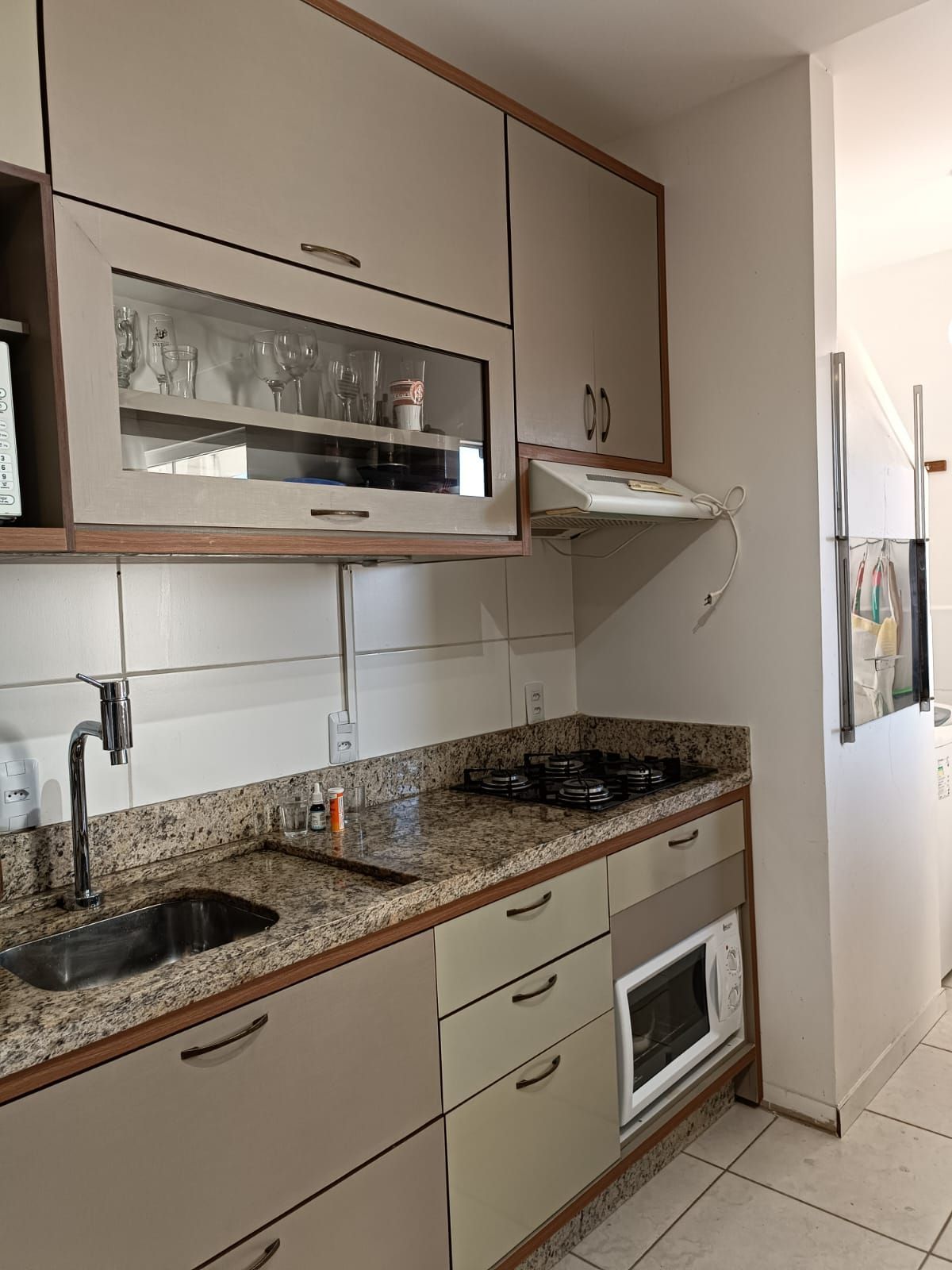 Cozinha prática e funcional, com espaço para refeições rápidas e utensílios domésticos.
