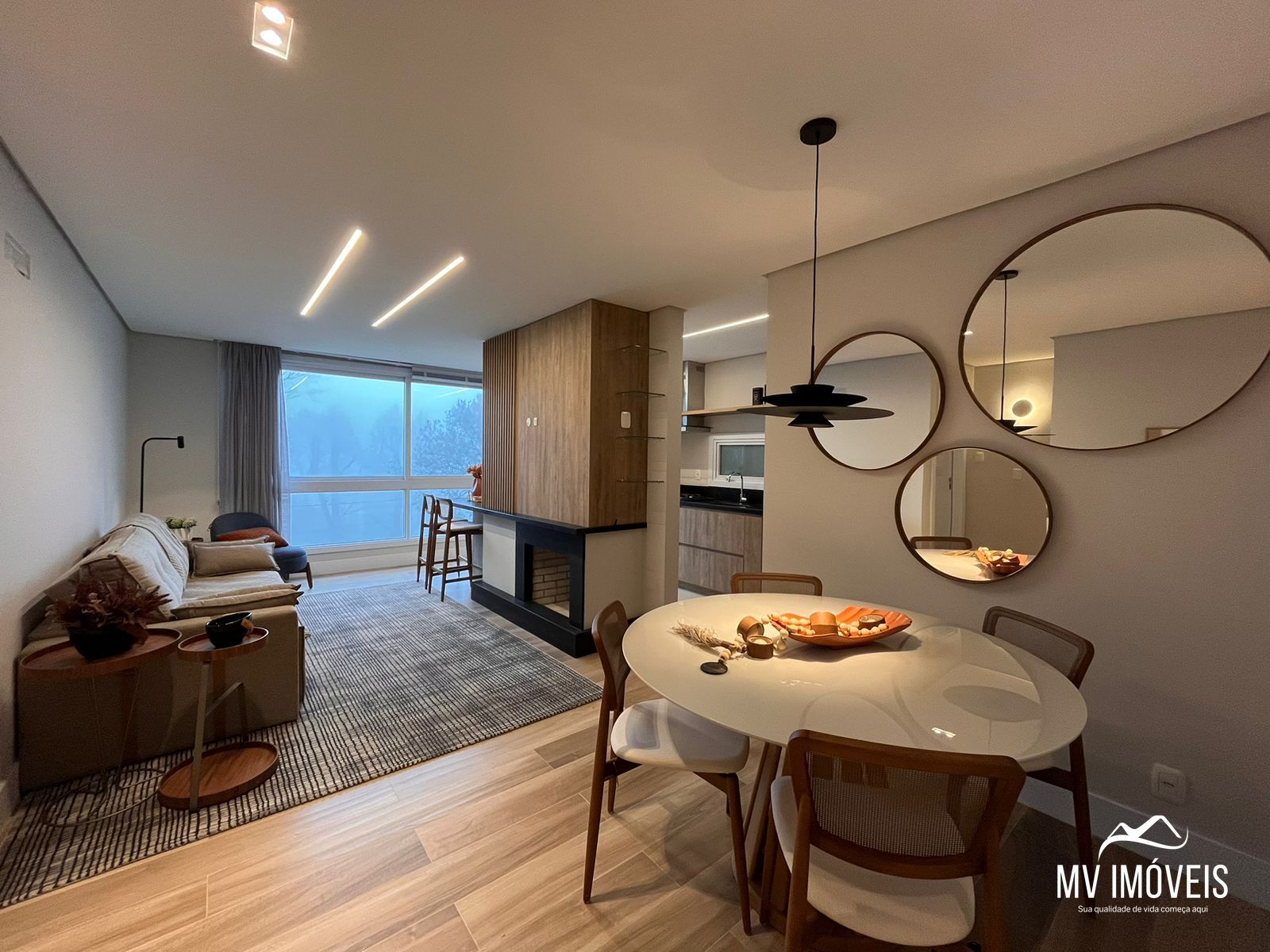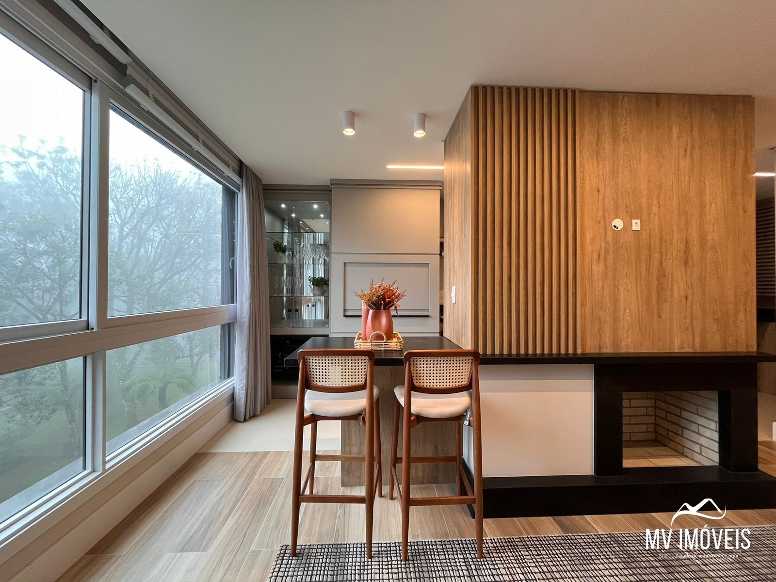 Apartamento de 82 metros quadrados privativos, distribuídos em 2 dormitórios, ambos sendo suítes, lavabo, cozinha, sala de estar e jantar, lareira, churrasqueira, área de serviço e uma vaga de garagem.