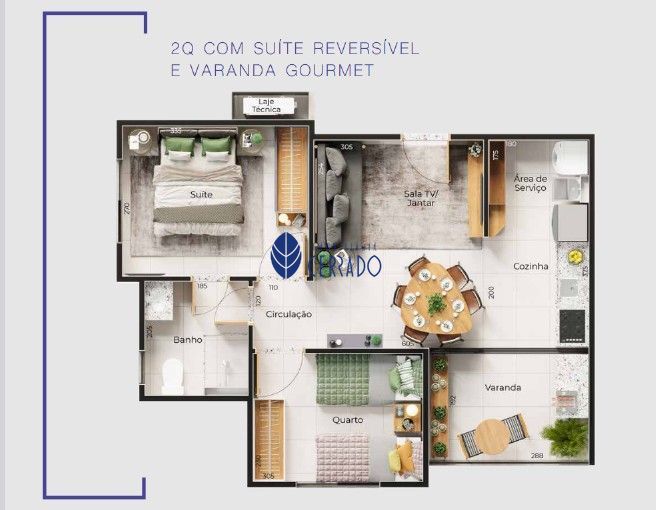 Apartamento de 2 quartos, sendo 1 suíte reversível, varanda gourmet, banheiro social, sala de estar, cozinha com área de serviço integrada, planta moderna e bem distribuída.