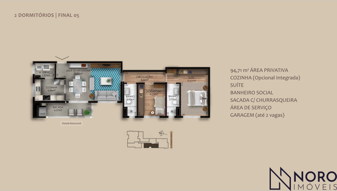 Excelente apartamento de 94 m² privativos, mobiliado, no coração do Centro de Santa Maria. Conta com 2 dormitórios (1 suíte), sala ampla, espera para lareira e água quente, além de aberturas de alto desempenho térmico e acústico. Persianas dos dormitórios em alumínio e mecanizadas, garantindo mais conforto e privacidade. Possui 1 vaga de garagem com opção para segunda vaga.