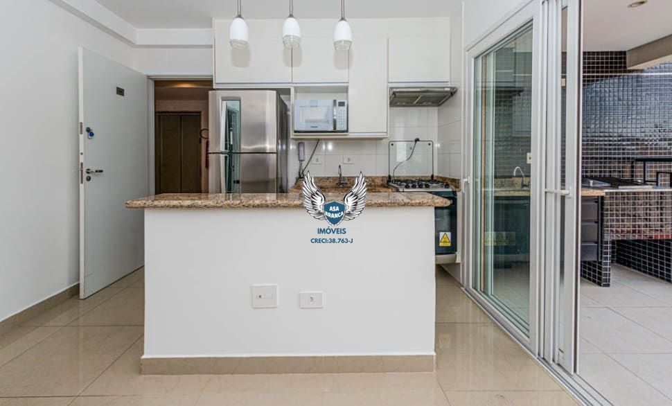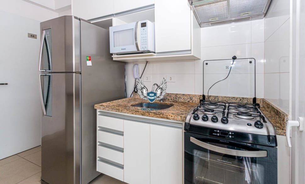 Este imóvel possui 1 dormitório com armário, 1 banheiro com armário, chuveiro e espelho, sala e cozinha americana com armários embutidos, além de geladeira, micro-ondas e fogão.
