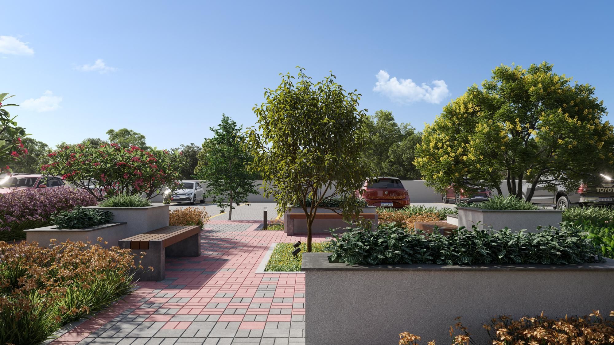Pomar, horta coletiva, praças e praça do fogo (fireplace)