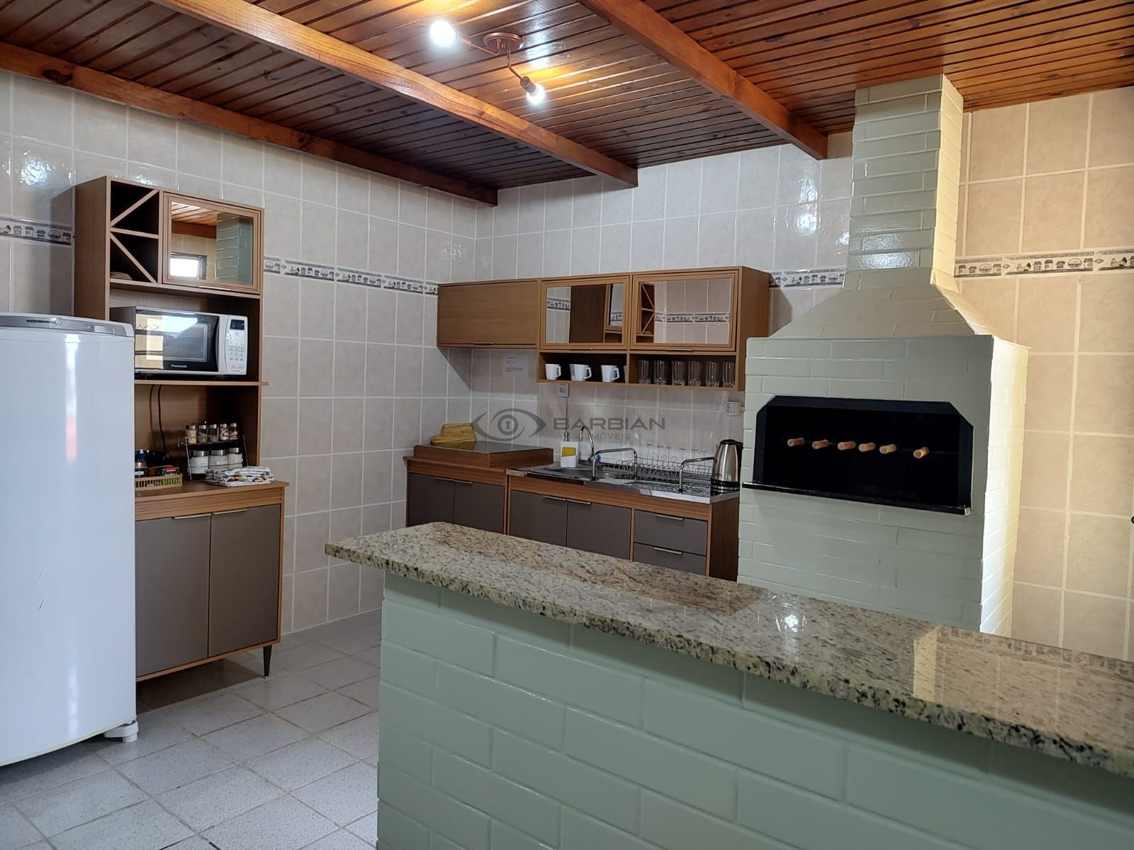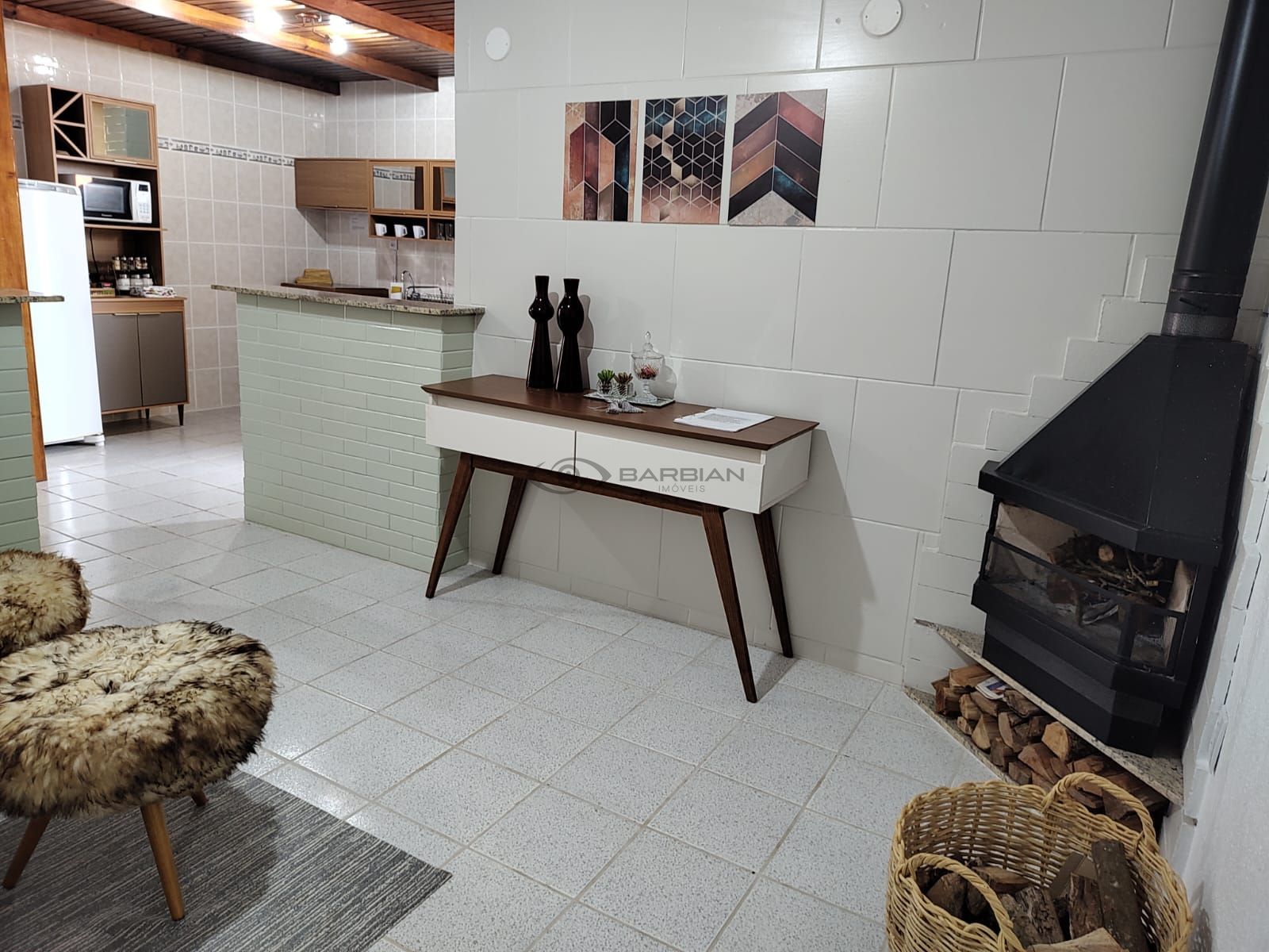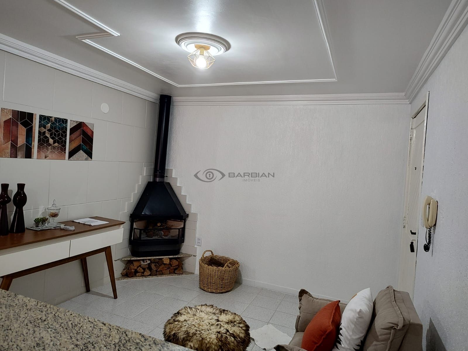 Dispõe de 1 dormitório, sala de estar com lareira, sala de jantar, cozinha com churrasqueira, área de serviço, banheiro e vaga de garagem.