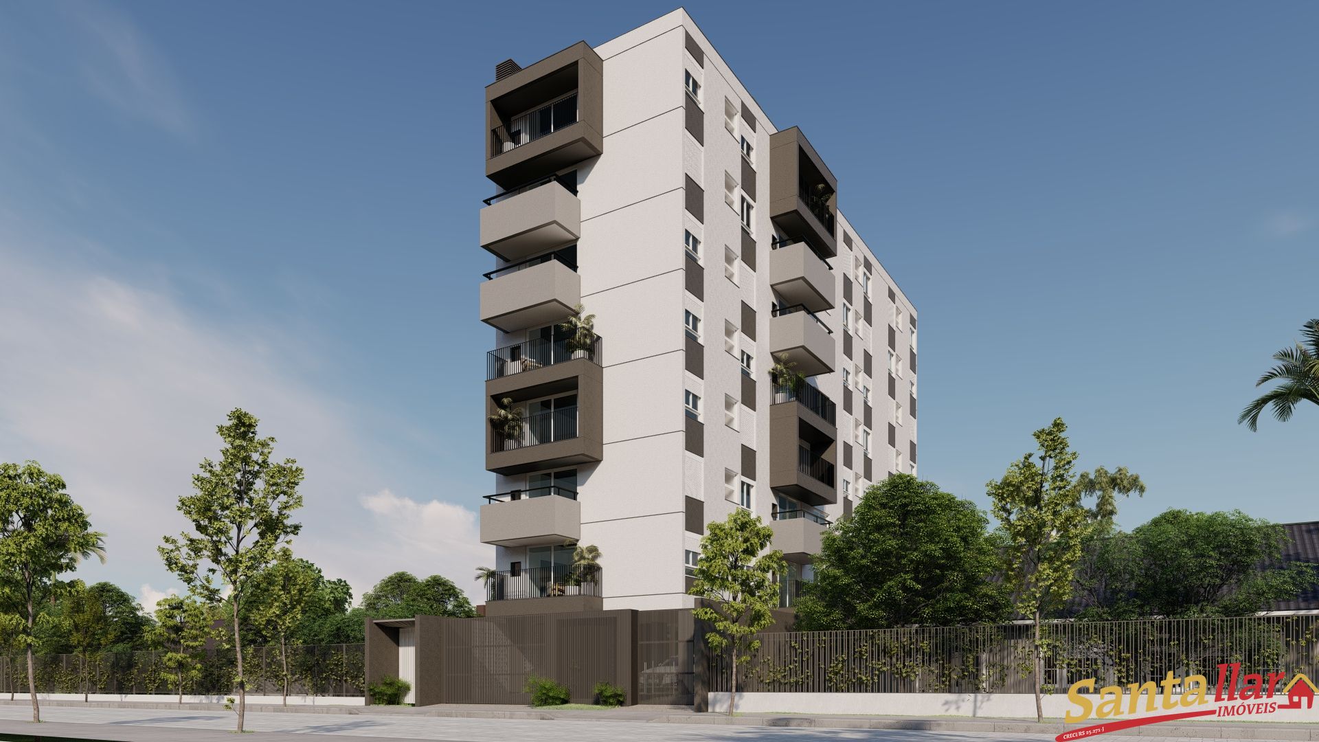 O destaque do empreendimento está na volumetria das sacadas, que se intercalam criando movimento na fachada. As venezianas de correr garantem uma estética dinâmica e funcional, especialmente na face norte.