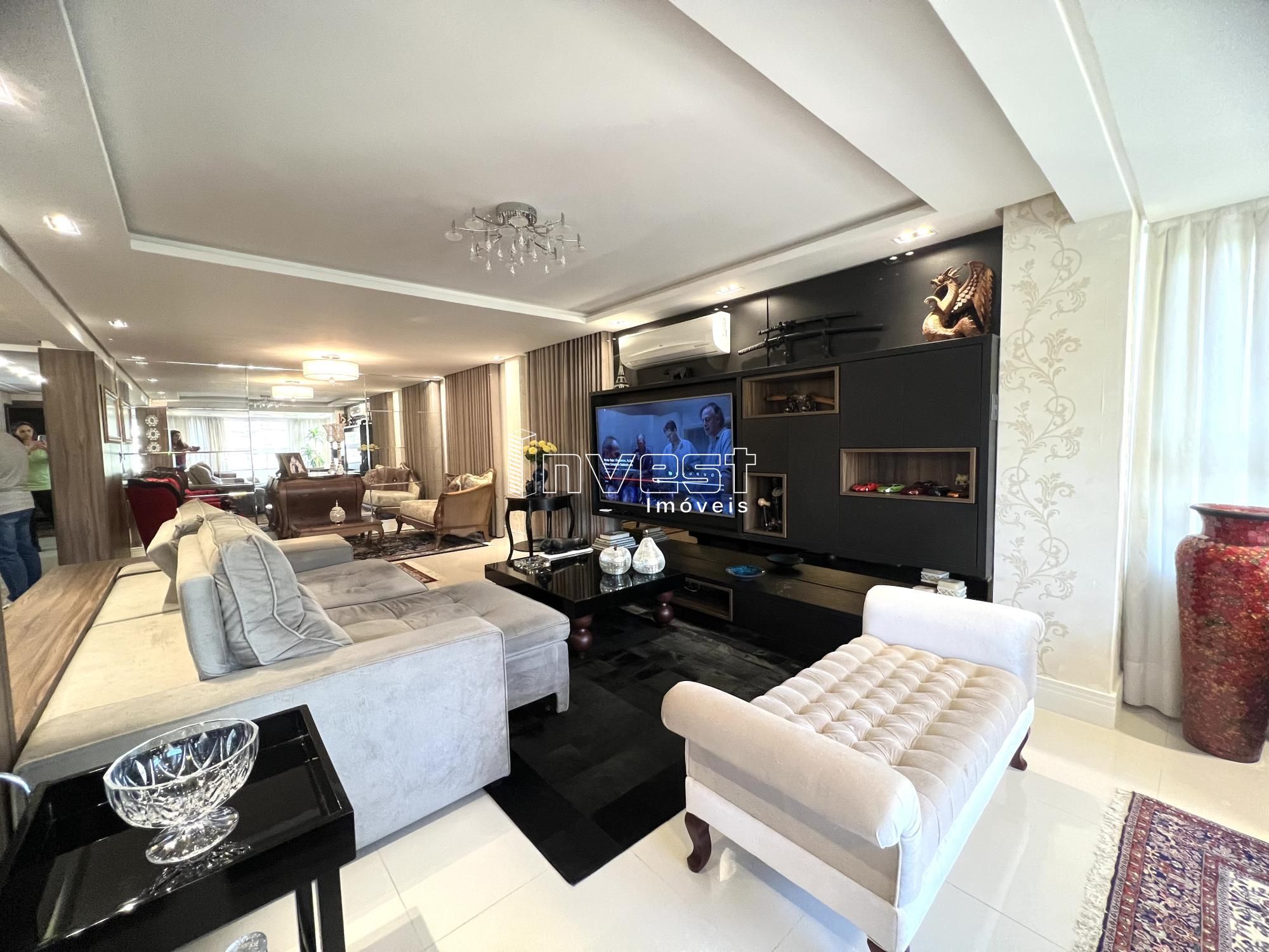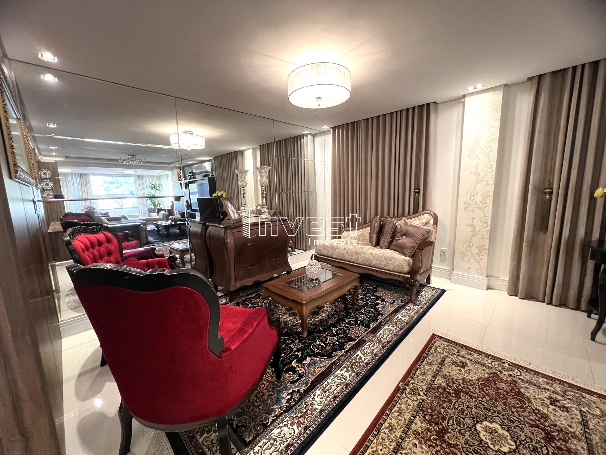 Apartamento de alto padrão em bairro nobre! Sendo 03 suítes, estar social em 04 ambientes, cozinha, lavanderia, hall de entrada, churrasqueira, lavabo e 03 boxes, elevador panorâmico. Ficam os móveis fixos incluindo cama casal em Mdf e cana king em Mdf. Iluminação ficam os spots e plaflons os demais não. Ficam os espelhos fixos, split. Cozinha completa menos a geladeira,