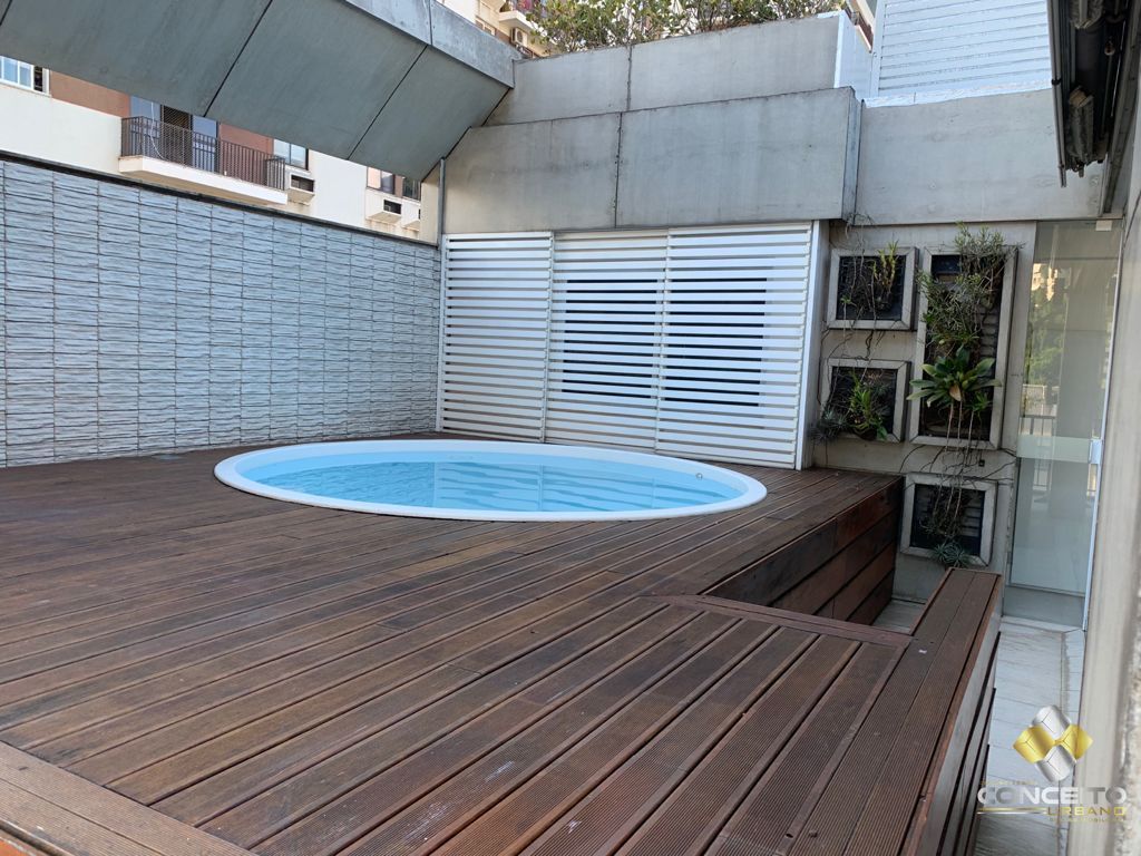 Magnífica Cobertura Duplex com vista privilegiada Cobertura Duplex com dois quartos ( uma suíte master), mas originalmente são 3 quartos. Toda Mobiliada e com alguns eletros Área privativa de 183 m² 3 banheiros no piso inferior e 1 banheiro no piso superior Piscina para até 10 pessoas, com toldo retrátil Espaço gourmet com esquadrias reiki Churrasqueira, Fogão de duas bocas embutido, Forno elétrico, Máquina de lavar louça Duas vagas na garagem Na escritura, existe o direito de construir um terceiro piso. Quarto e banheiro de serviço Prédio com play, salão de festas , lanchonete e sauna. Vista da Lagoa Rodrigo de Freitas e do Pão de Açúcar. A suíte tem vidro triplo. Maiores informações Vanderlei Sperotto Creci 45.646 (54) 999 66 34 54