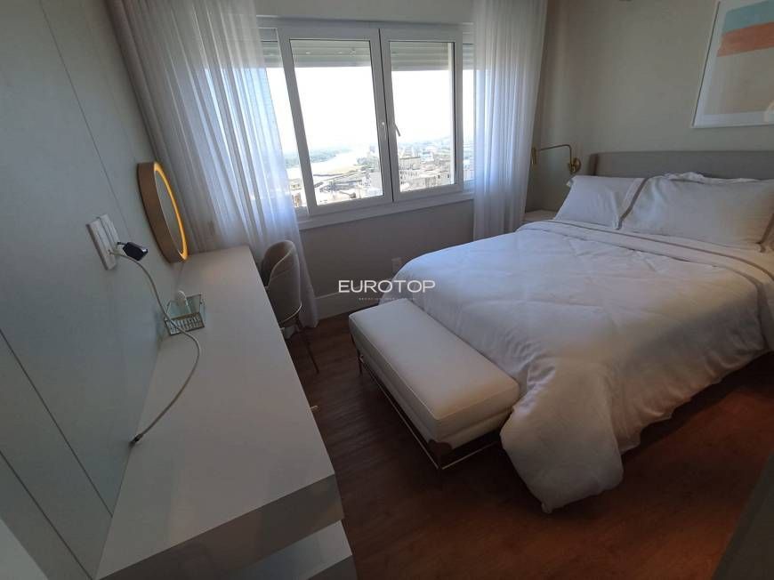 Eurotop vende excelente apartamento finamente mobiliado, equipado e decorado, em estado de novo, 2 dormitórios, 2 banheiros, último andar, aberturas termo acústicas, vidros duplos, vista definida para o Guaíba, piso em porcelanato/laminado, vaga estacionamento mensal no próprio edifício (em torno de R$ 150,00 ao mês). Imóvel fica conforme está nas fotos, tudo incluso. Faça sua proposta!