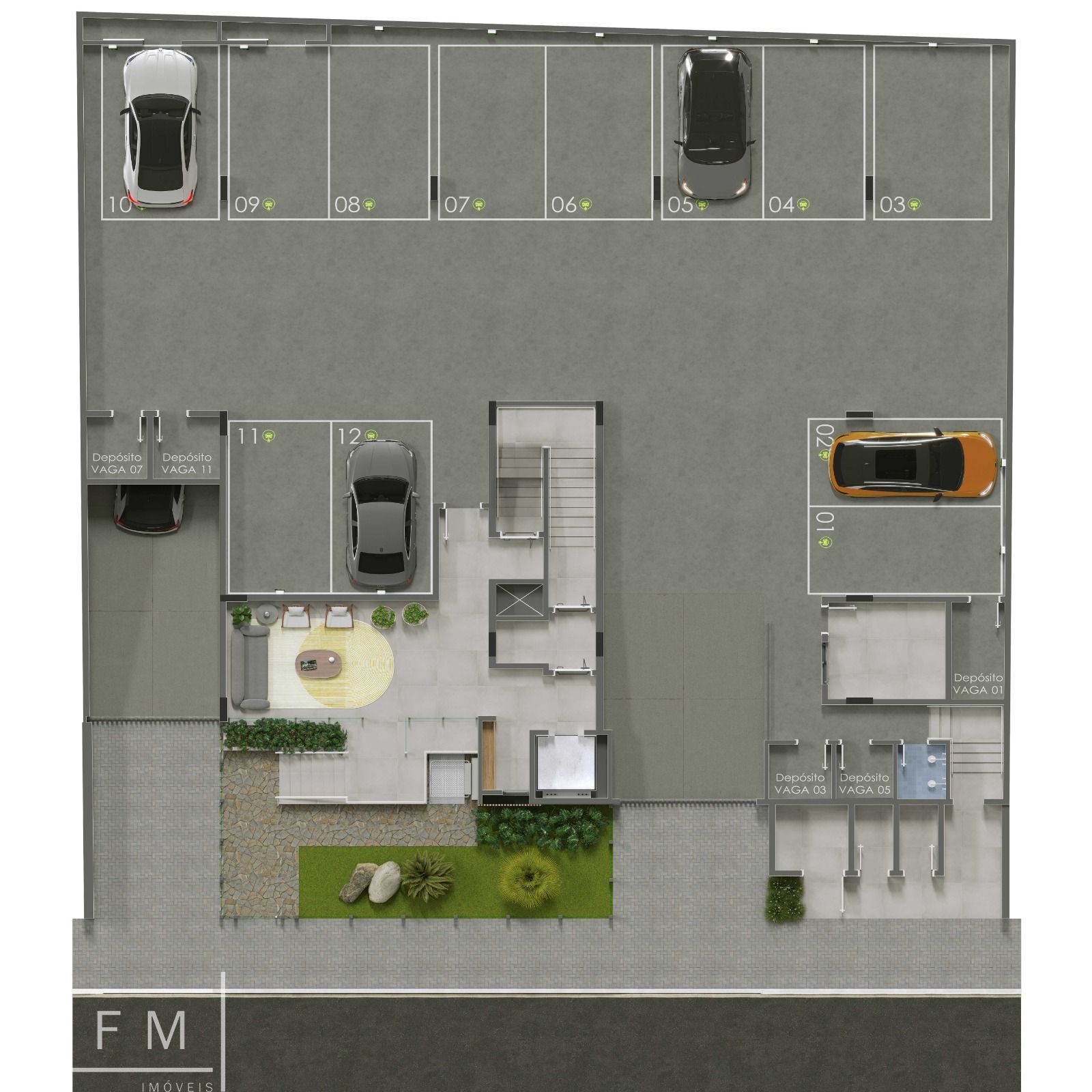 2 vagas de garagem e1 depósito por apartamento.