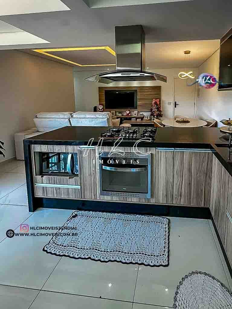 A cozinha com ilha é um dos grandes diferenciais do imóvel: totalmente planejada, equipada com fogão, forno embutido e coifa, e integrada à área social, trazendo amplitude e modernidade. A varanda conta com churrasqueira a carvão, fechamento em vidro e vista livre, oferecendo um ótimo espaço para convivência.