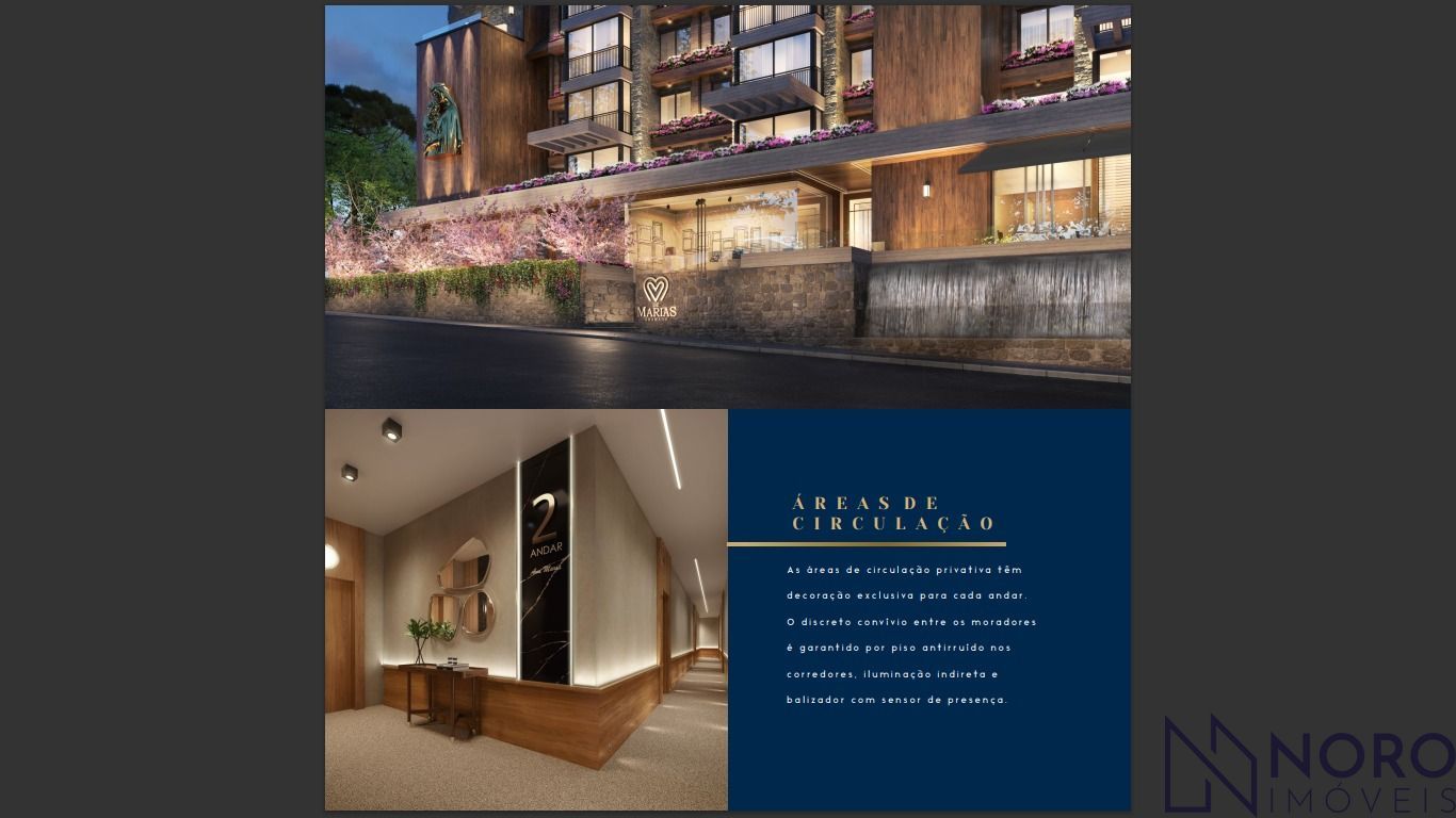 Apartamento com 2 suítes com entradas independentes e com o conforto de um terraço que é um convite para o ar puro da serra. Um caráter único e um valor arquitetônico sem igual . As características da construção de estilo alpino com leitura contemporânea reverência de de Gramado. São 2 7 A PA R TA M E N T O S U LT R A E X C L U S I V O S As áreas de circulação privativa têm de coração exclusiva para cada andar. O discreto convívio entre os moradores é garantido por piso antirruído nos corredores , iluminação indireta e balizador com sensor de presença .