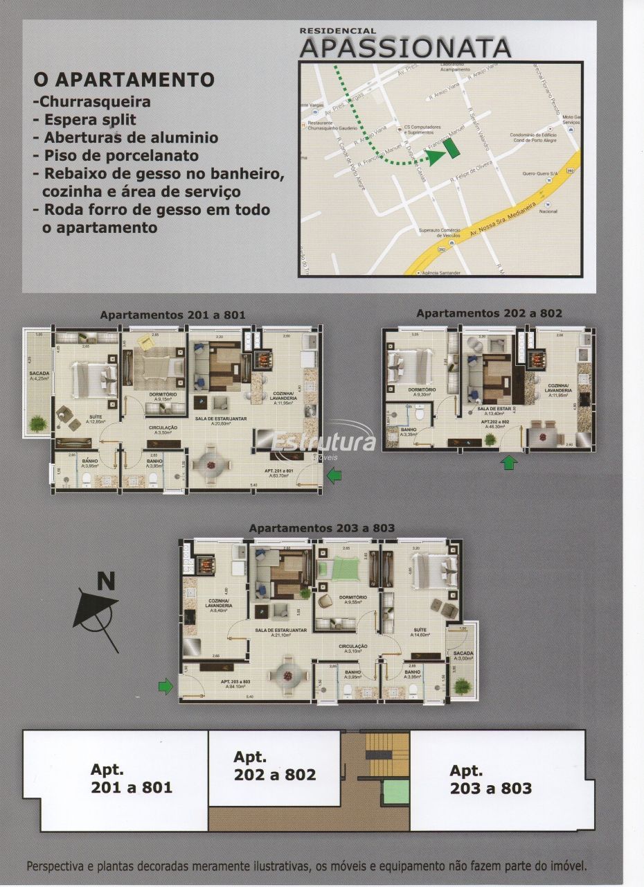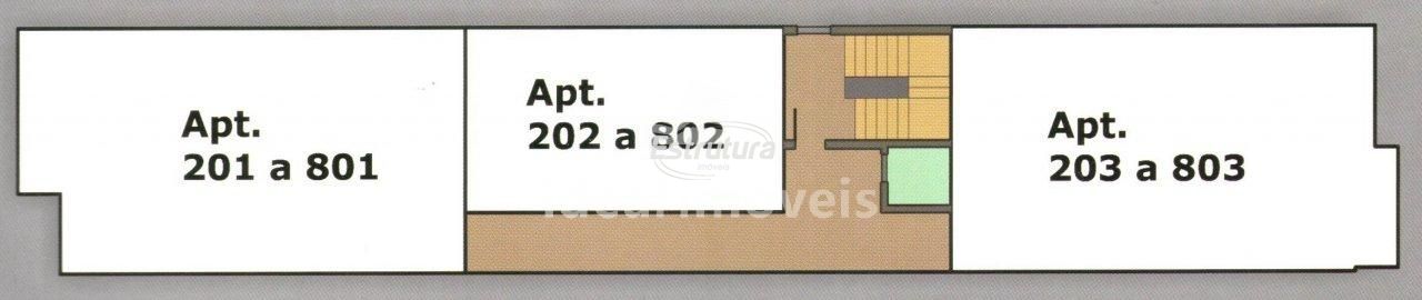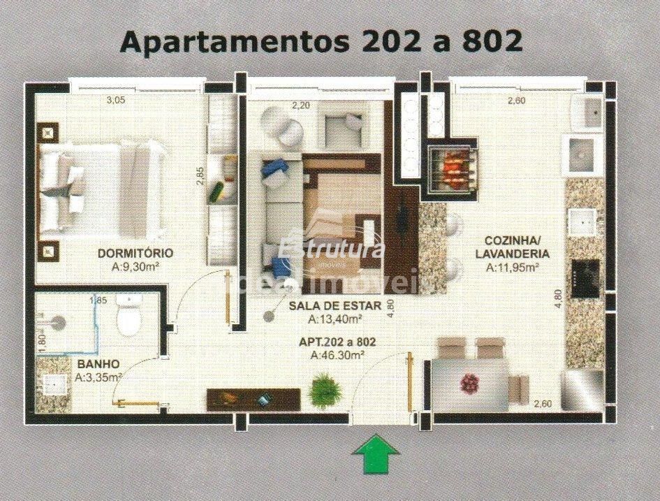 Apartamento com 1 dormitório, 1 banheiro, sala de estar, cozinha com área de serviço e churrasqueira. Sem Box. temos as unidades 302, 402, 502, 602, . consulte tabela. sem box Sacada nos apartamentos de 2 dormitórios Espera para split Aberturas em alumínio Piso porcelanato Rebaixo de gesso no banheiro, cozinha e área de serviço Roda forro de gesso em todo o apartamento Gás central com medidor Elevador Pastilhas na sacada Hidrômetro individual Empreendimento Pronto!