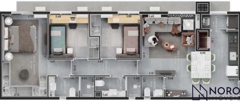Com uma área privativa generosa de 105 m², proporciona amplo espaço para sua família. Oferece ainda: banheiro completo com box, chuveiro, espelho instalados e tampo de porcelanato, cozinha com tampo de pedra durabilidade e sofisticação.