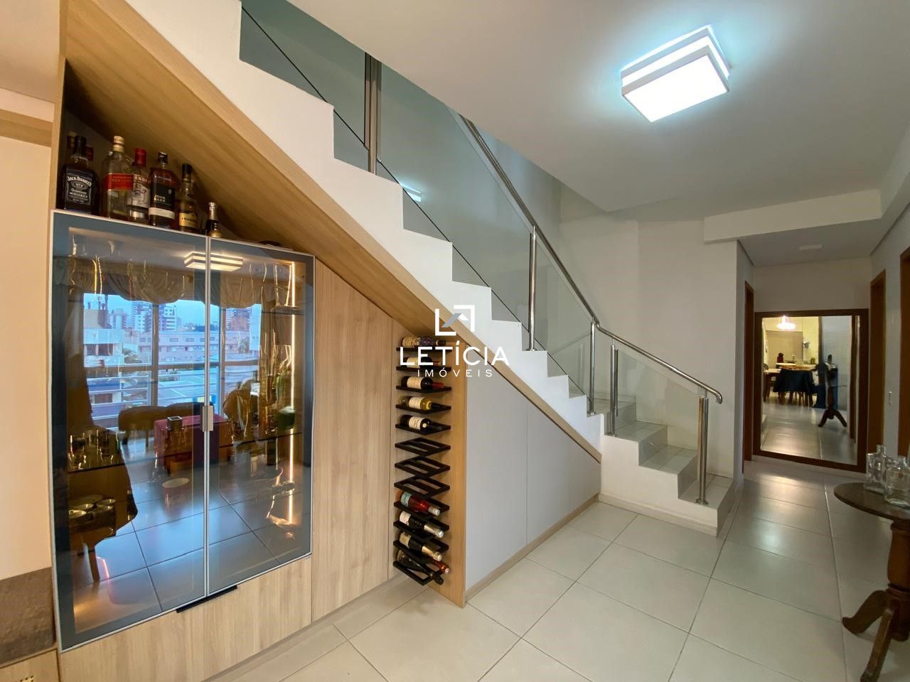 Logo ao entrar, você se depara com uma ampla sala de estar integrada a dois ambientes, decorada com uma cristaleira feita sob medida, que se destaca pelo refinamento e iluminação em LED, criando uma atmosfera elegante e acolhedora. Todos os ambientes são ricamente mobiliados com planejados de extremo bom gosto, pensados para aliar estética e praticidade. A cozinha, completa e equipada com móveis sob medida e iluminação embutida, proporciona um espaço funcional e moderno para o dia a dia. Ainda no pavimento inferior, há dois dormitórios decorados com armários planejados e iluminação de LED, além de um banheiro social com box em blindex e armário planejado. A suíte principal é um verdadeiro refúgio, oferecendo espaço, móveis sob medida e iluminação cuidadosamente projetada para valorizar cada canto do ambiente.