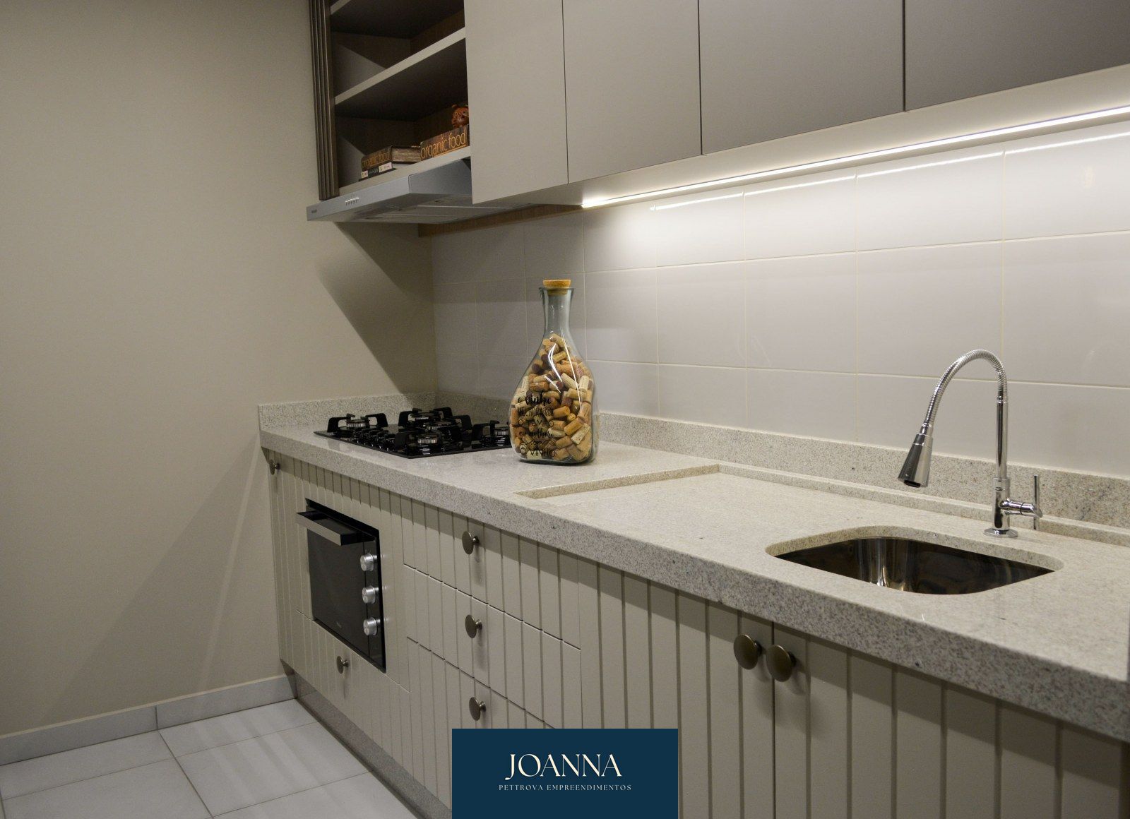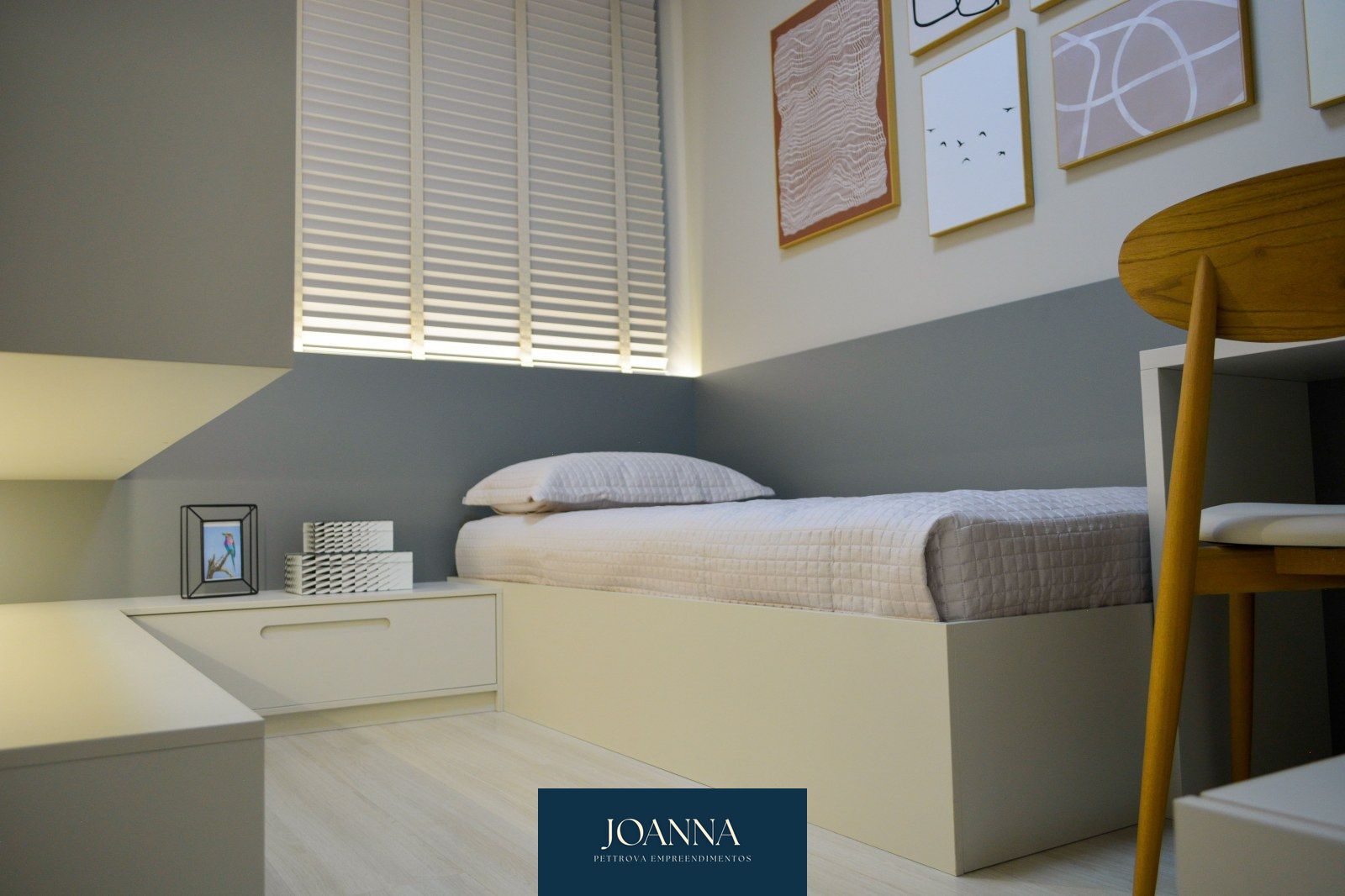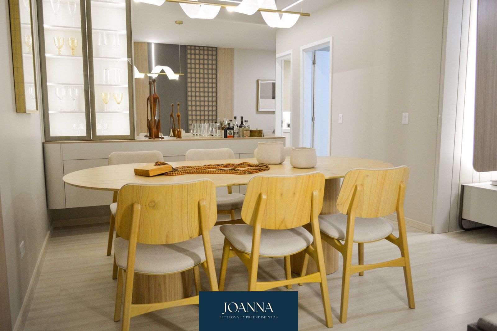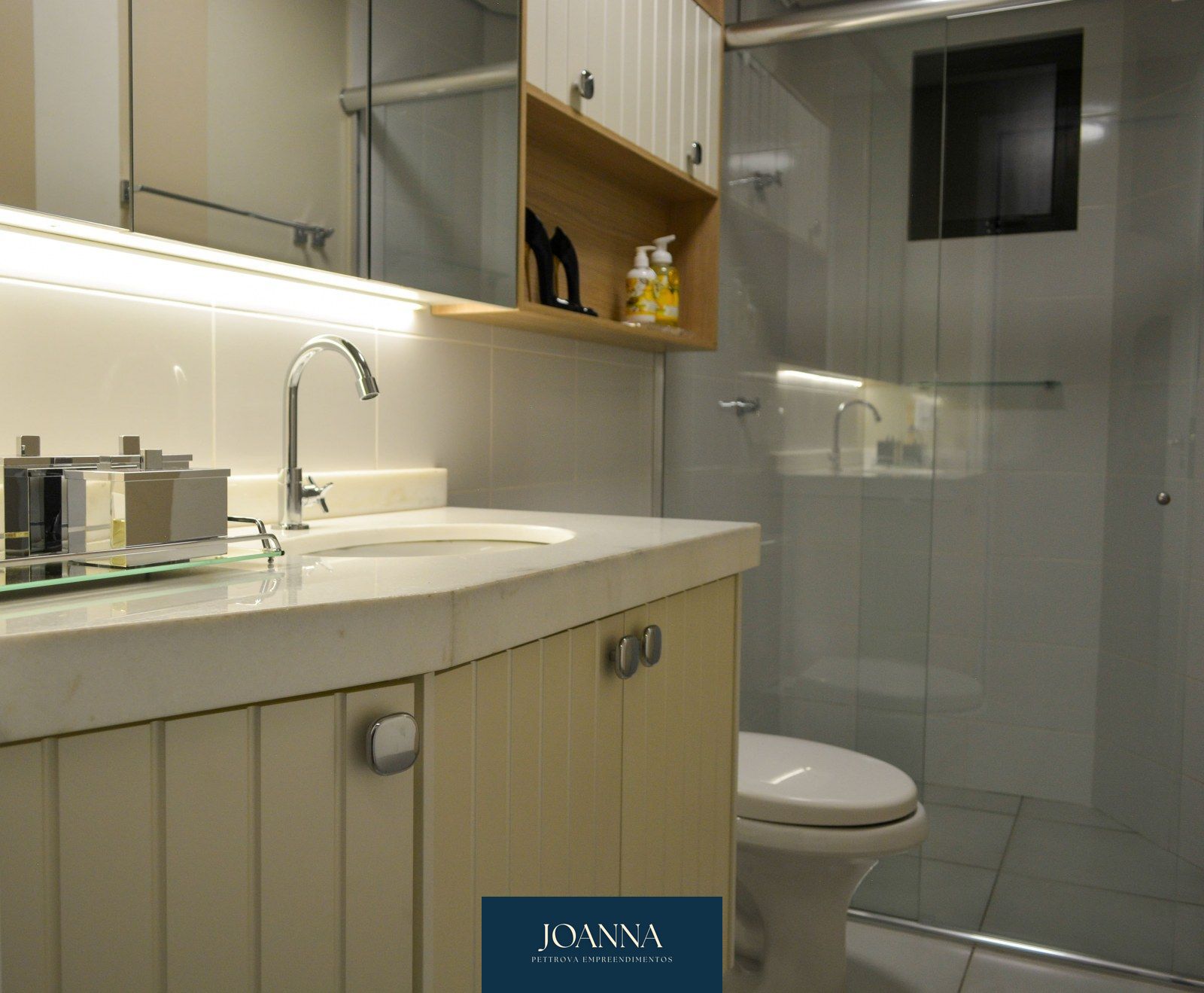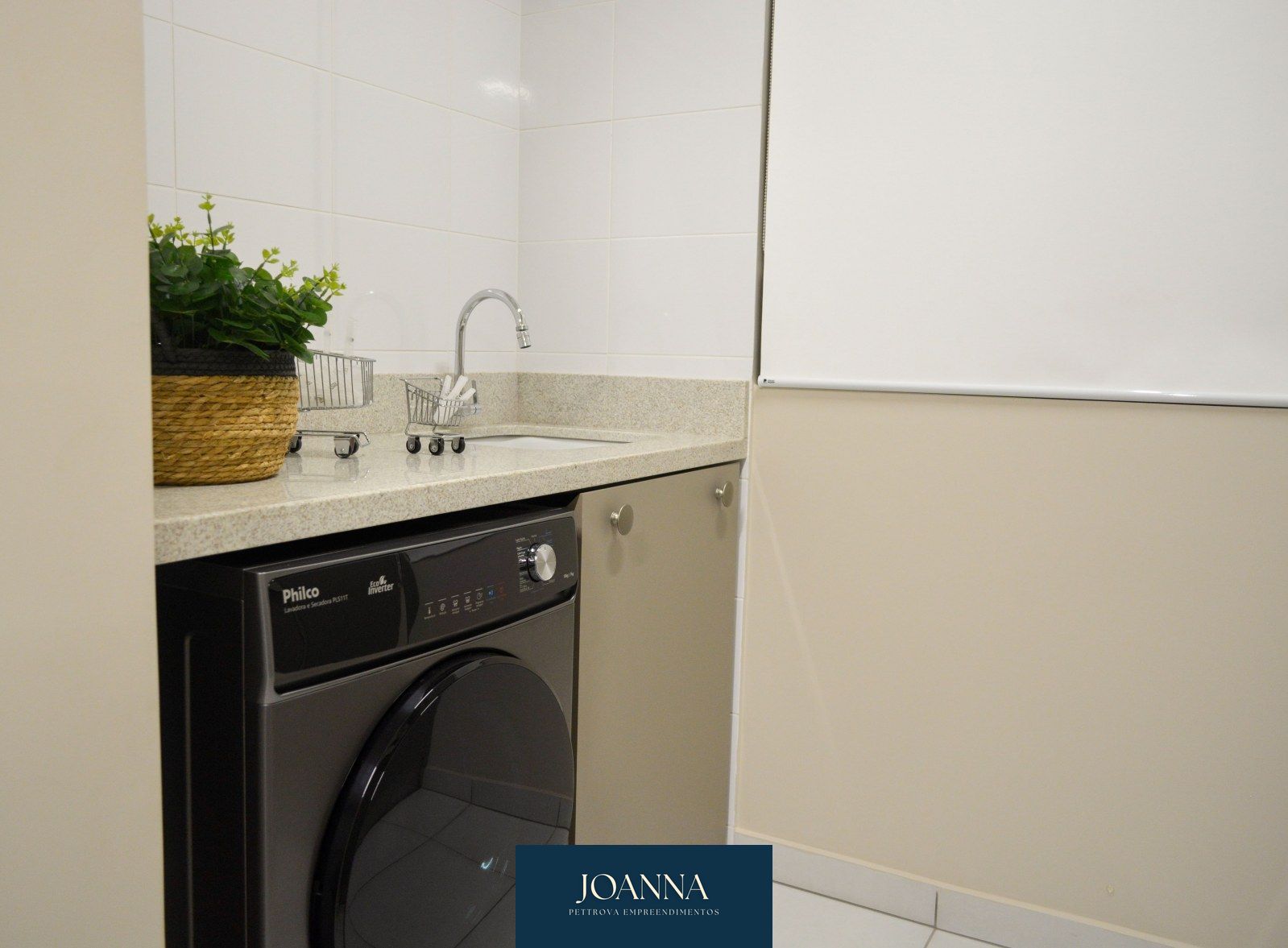 Os detalhes do piso são em laminado nas áreas secas, e porcelanato nas áreas molhadas.