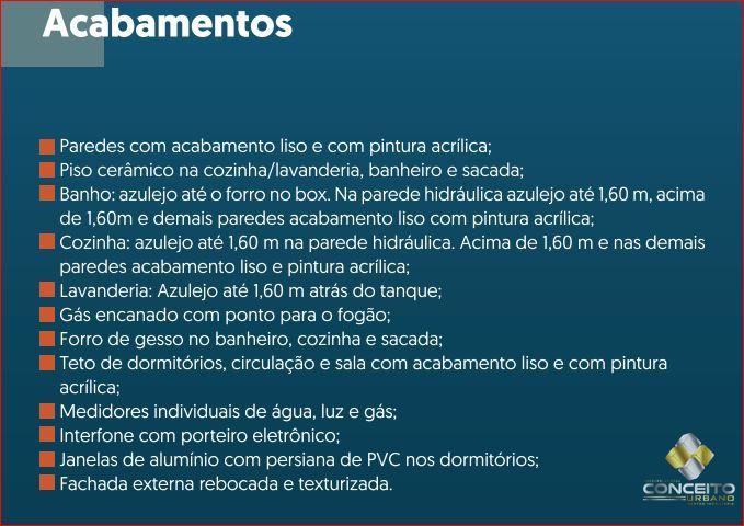 Banho: azulejo até o forro no box. Na parede hidráulica azulejo até 1,60 m, acima de 1,60m e demais paredes acabamento liso com pintura acrílica;