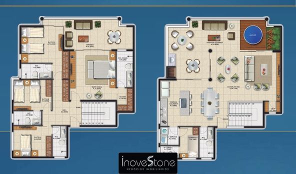 ▪️ Coberturas duplex nos Bangalôs de 203m2- com 04 suítes + Dep empregada, varanda gourmet.