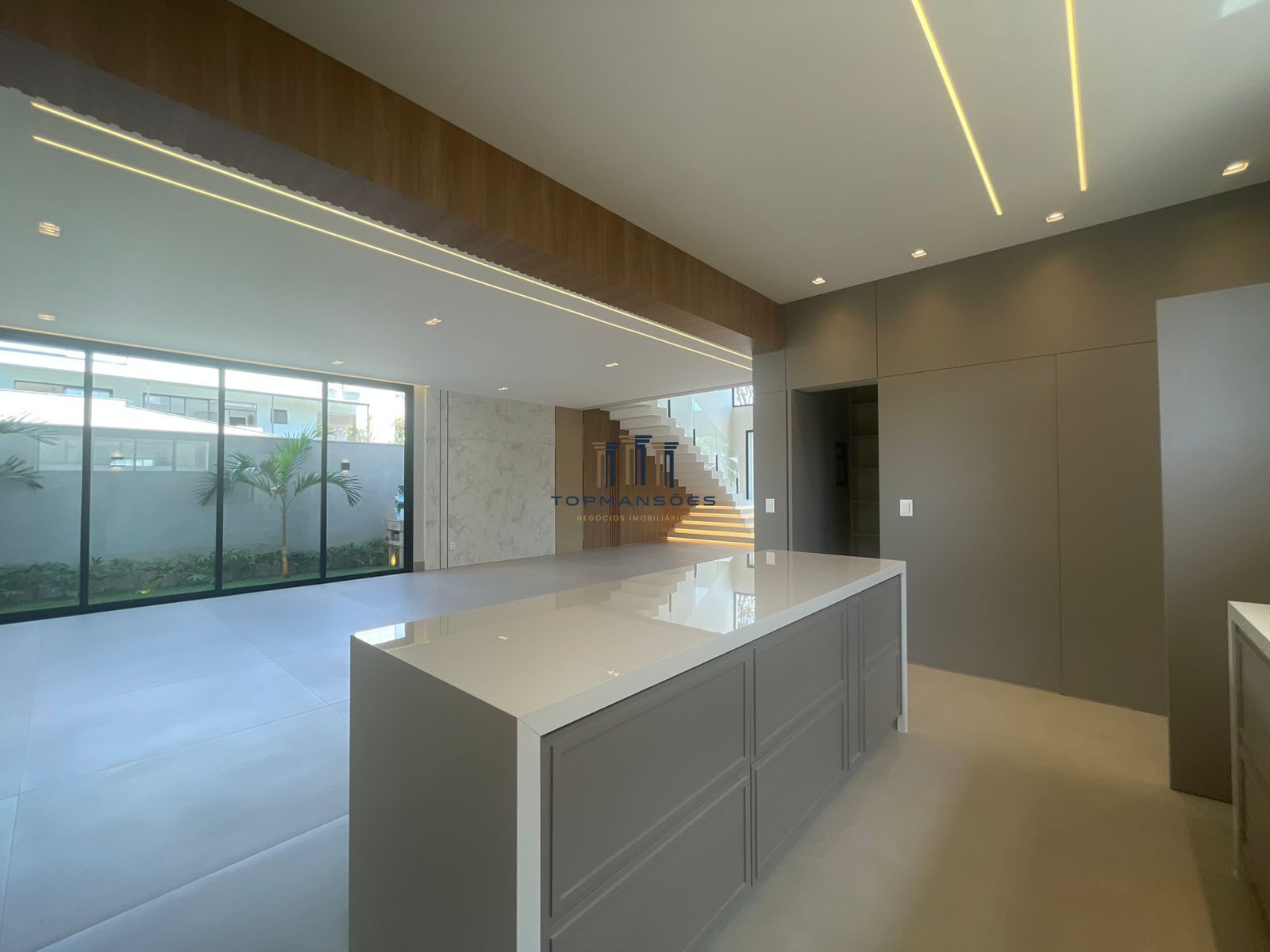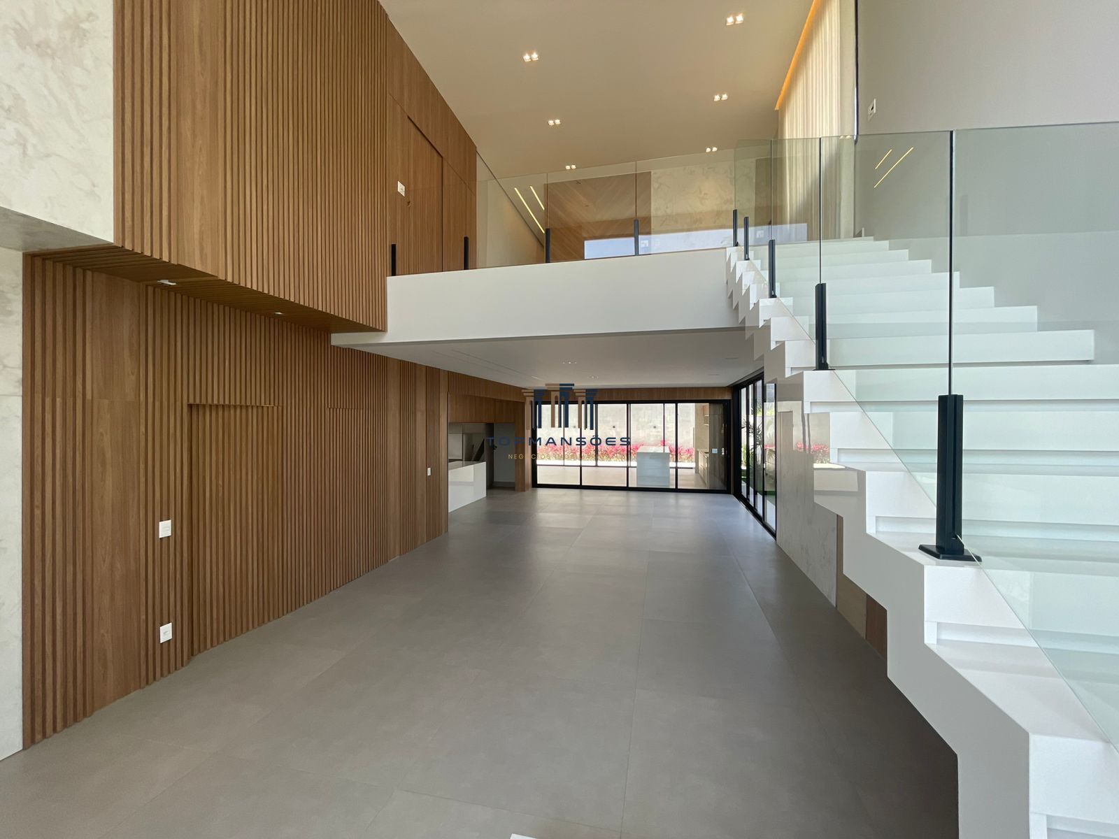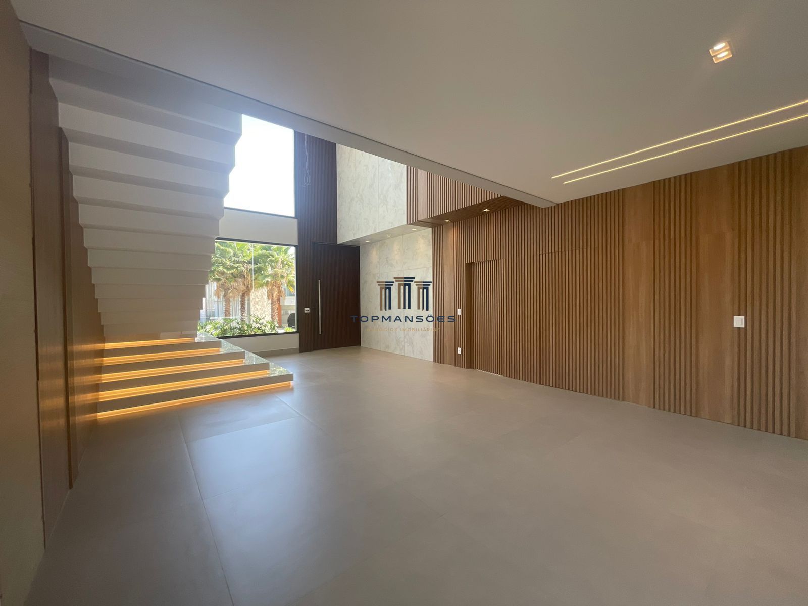 Sala ampla com acabamento em porcelanato, lavabo, painel ripado com portas embutidadas de acesso à garagem e lavabo, ambiente com belissima escada em Nano Glass com iluminacao indireta em led.