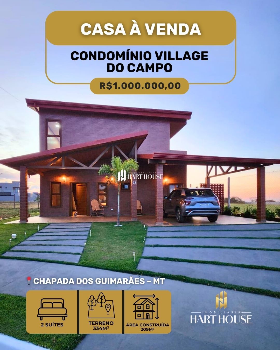 Linda casa à venda em Chapada dos Guimarães – MT Condomínio Village do Campo Encante-se com esta belíssima casa com 209 m² de área construída, em um terreno de 334 m², localizada em um dos condomínios mais charmosos e tranquilos de Chapada dos Guimarães. ✨ Destaques do imóvel: • 2 amplas suítes, sendo a superior com closet, banheira de imersão e varanda com vista deslumbrante para o Vale do Jamacá • Escritório, que pode ser facilmente transformado em um terceiro quarto • Sala e cozinha integradas, com ótimo aproveitamento de luz natural • Área gourmet completa com churrasqueira e banheiro externo • Acabamentos de alto padrão: • Pisos e revestimentos em porcelanato • Esquadrias em PVC imitando madeira (BAZZE) • Portas internas e escada em madeira • Forro em PVC imitando madeira • Projeto de iluminação moderno e aconchegante Condomínio fechado com segurança e lazer completo: • Área gourmet • Piscina • Quadra de areia Valor: R$ 1.000.000,00 Informações e agendamento de visita: CRECI 15.410 J IMOBILIRIA HART HOUSE Telefone: (65) 99682-9209 ou (65) 998111-3304 Fixo: (65) 3041-1898