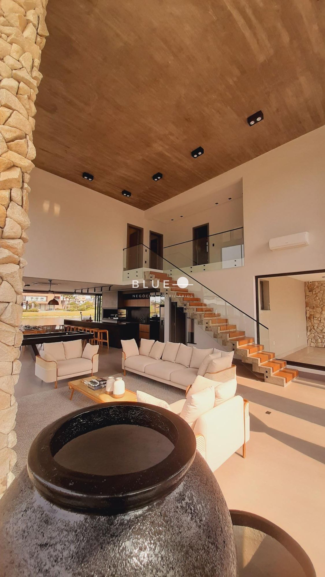 A sala principal possui pé direito duplo com 6.5 metros. Você pode contar com 5 suítes, uma térrea e quatro no pavimento superior, todas os armários planejados, cozinha equipada e completa, área de serviço, dependência de empregados e área de armazenamento.