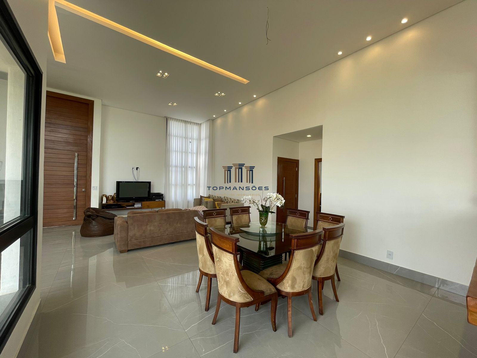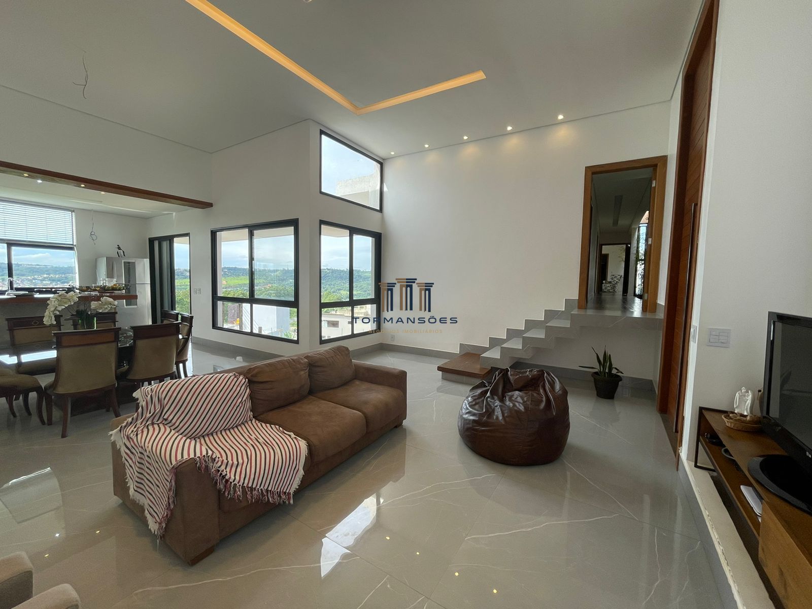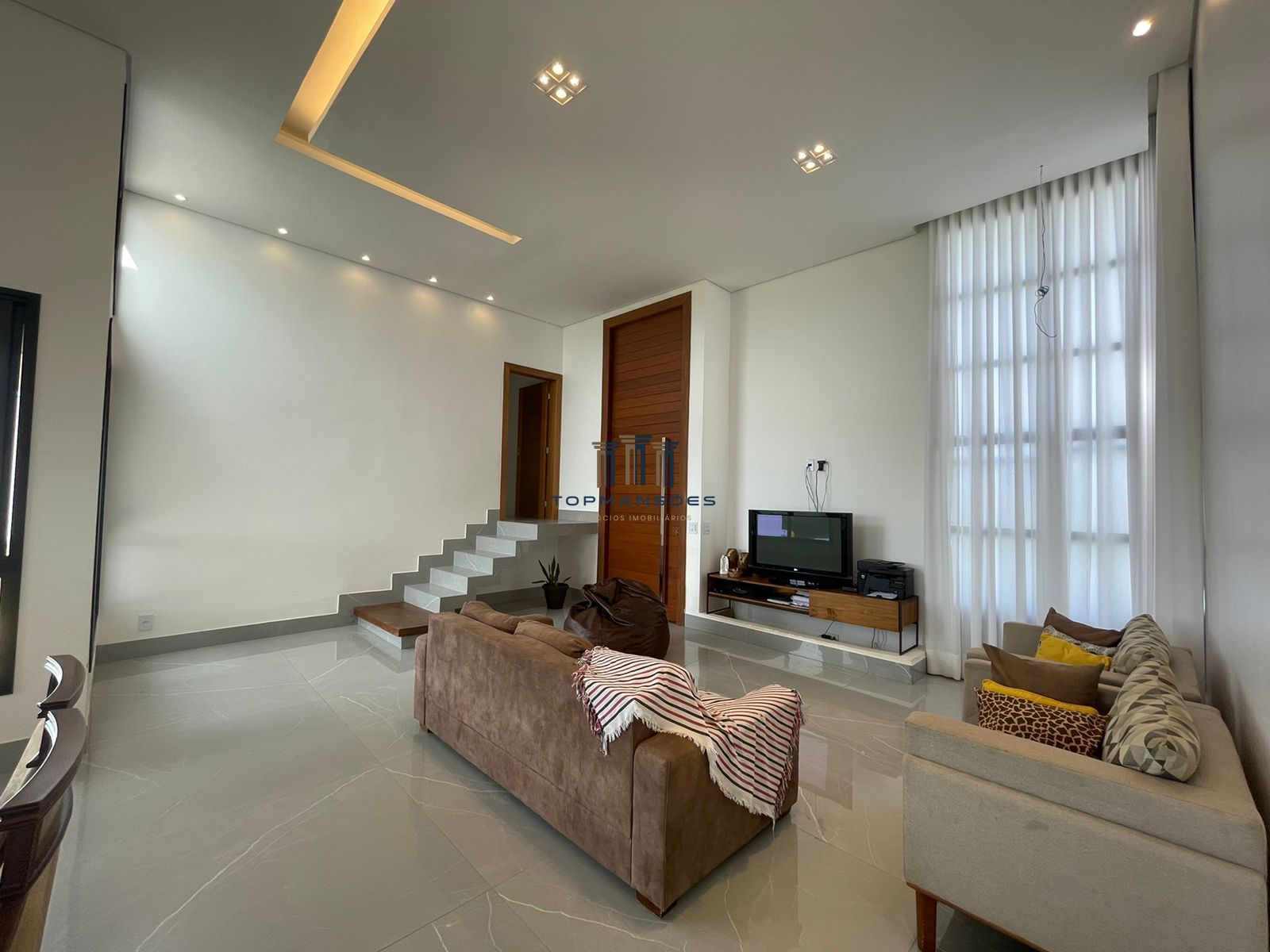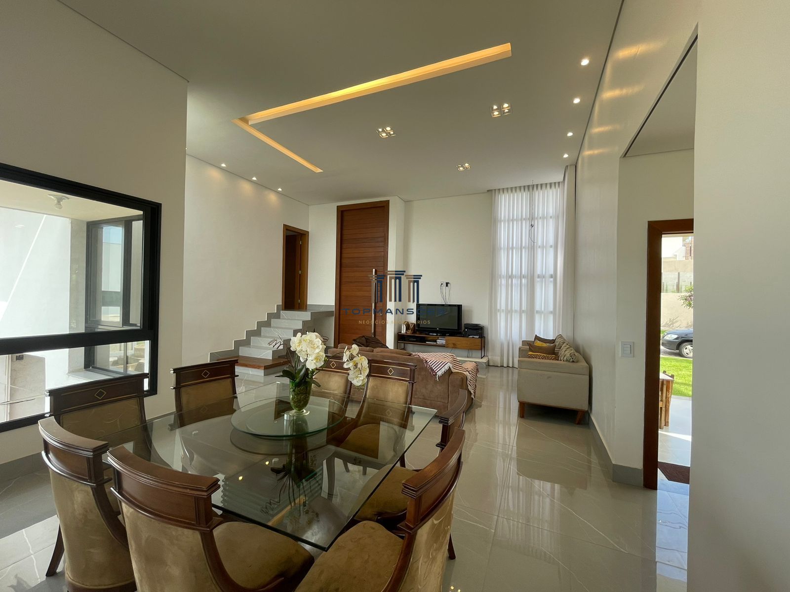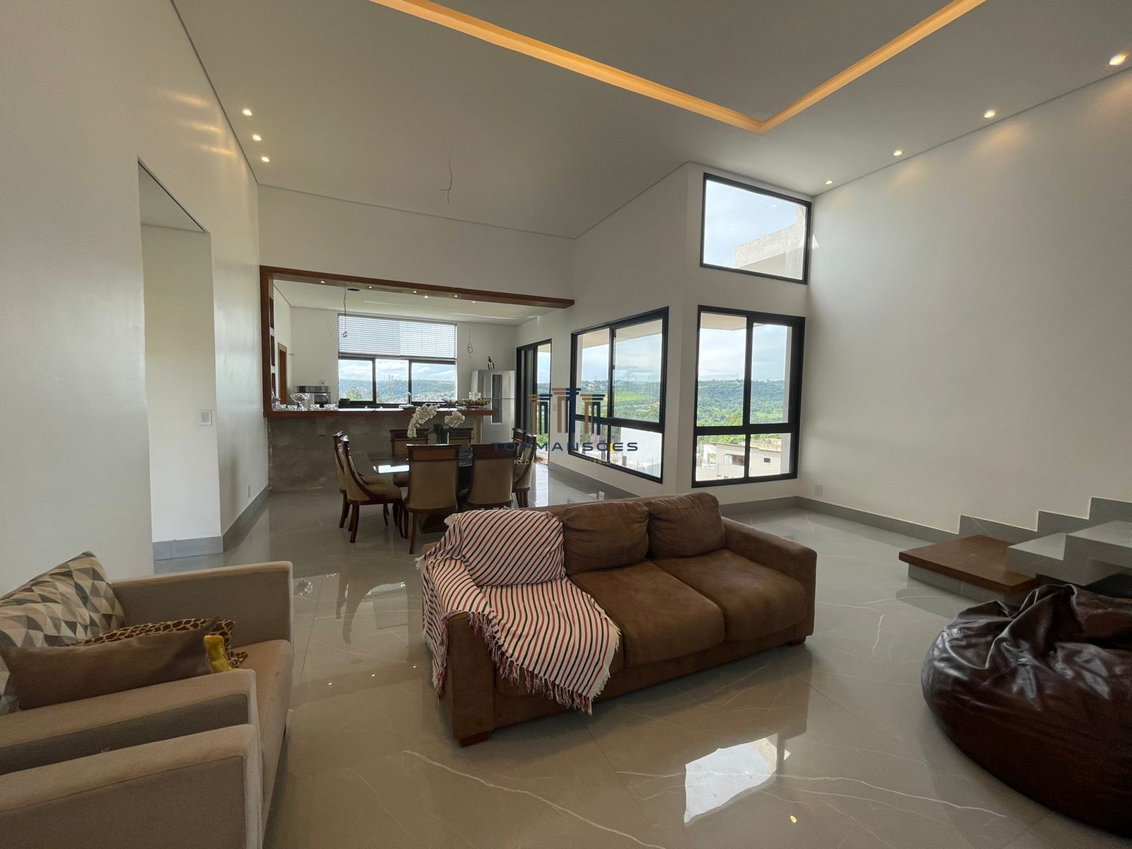 Ampla sala com pé direito alto rebaixada em gesso com projeto de iluminação, lareira a gás, lavabo, sala conjugada com cozinha estilo americano com cooktoop. Dispensa, area de serviço. Garagem para 4 carros, quarto de despejo.