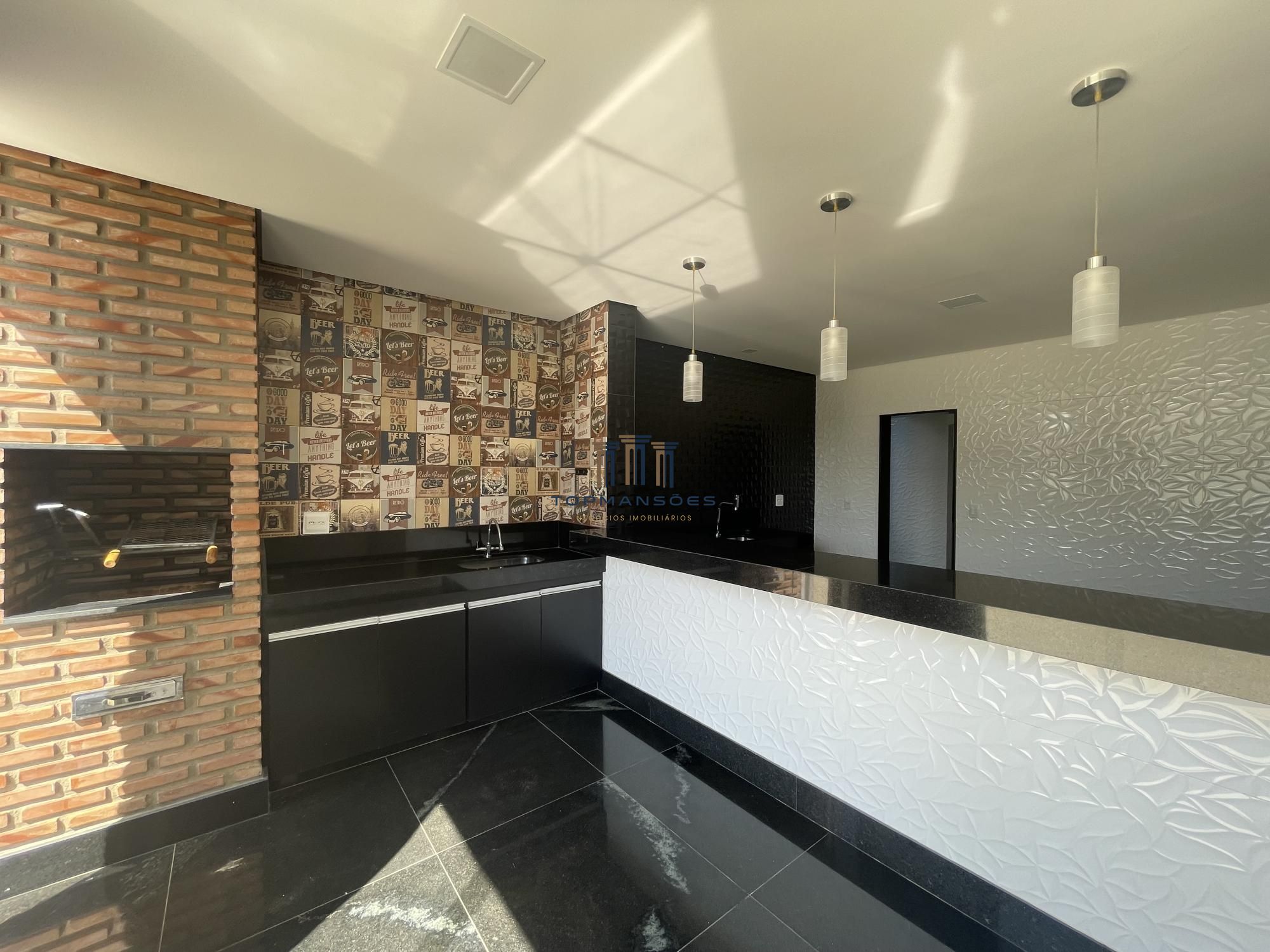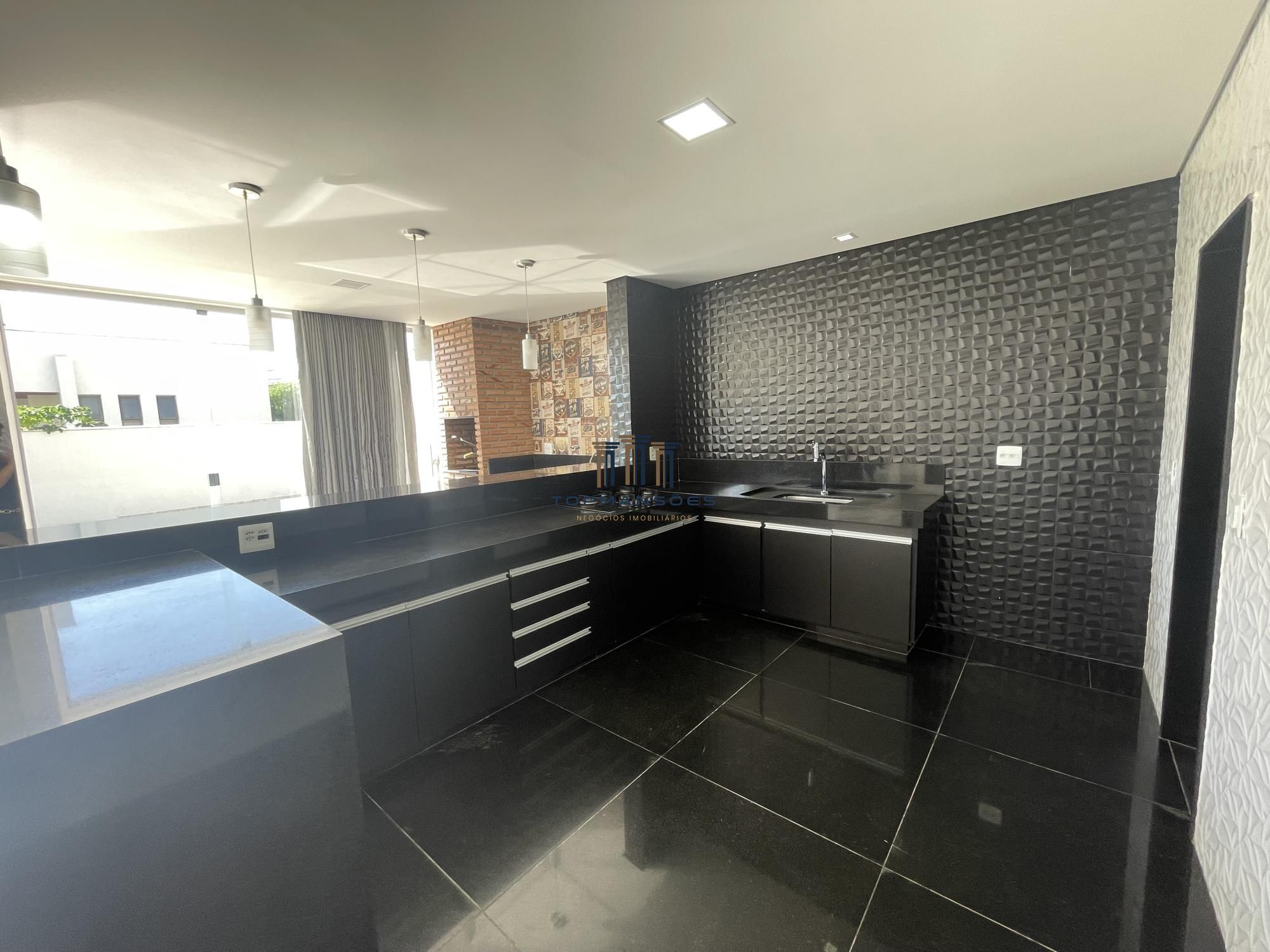 Casa com espaço gourmet e cozinha integrados com armários planejados.