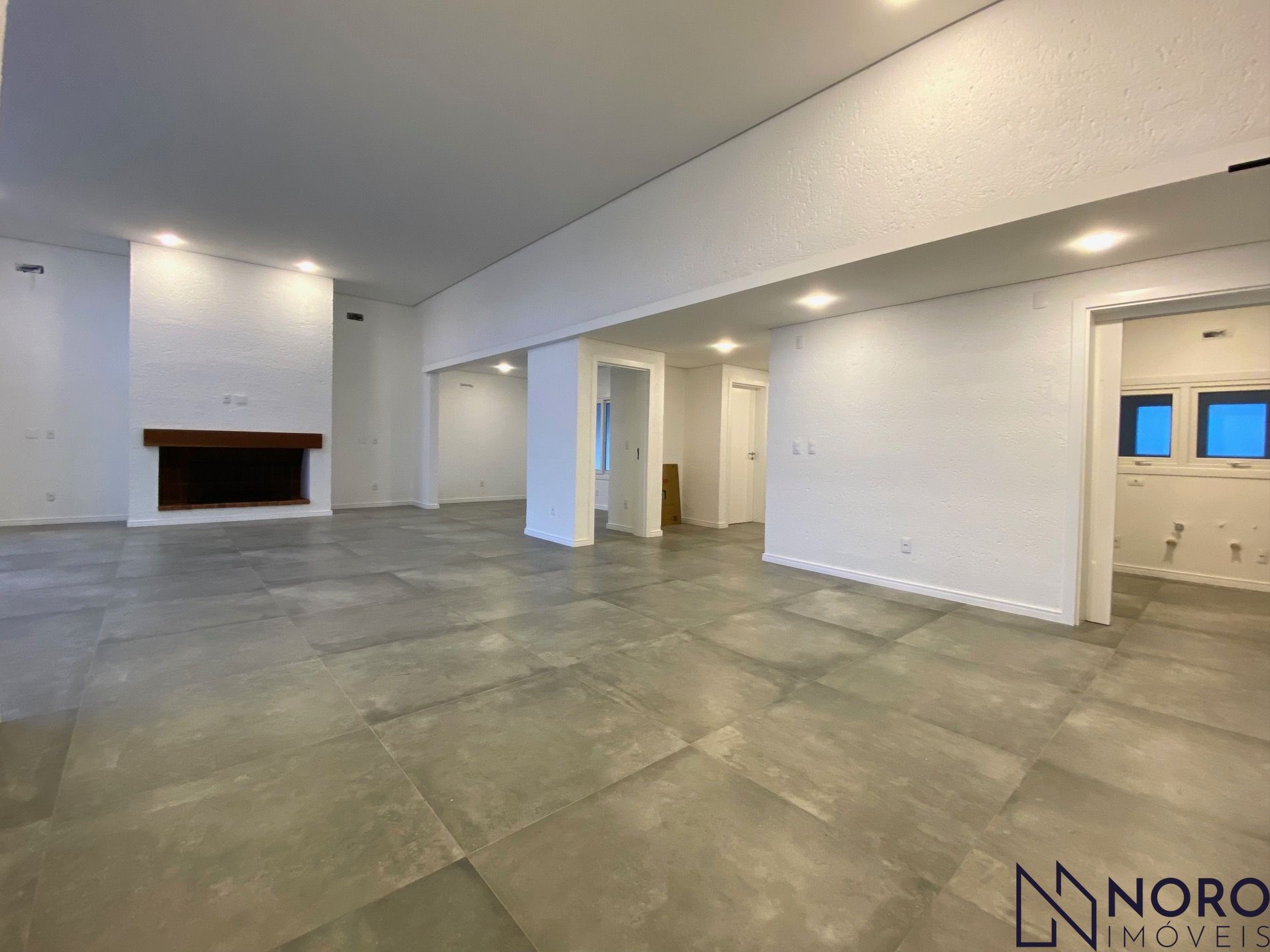 Hall de entrada, living com pé direito elevado para 3 ambientes integrados, lareira, parrilla, com porta janela gigante voltado para a piscina.