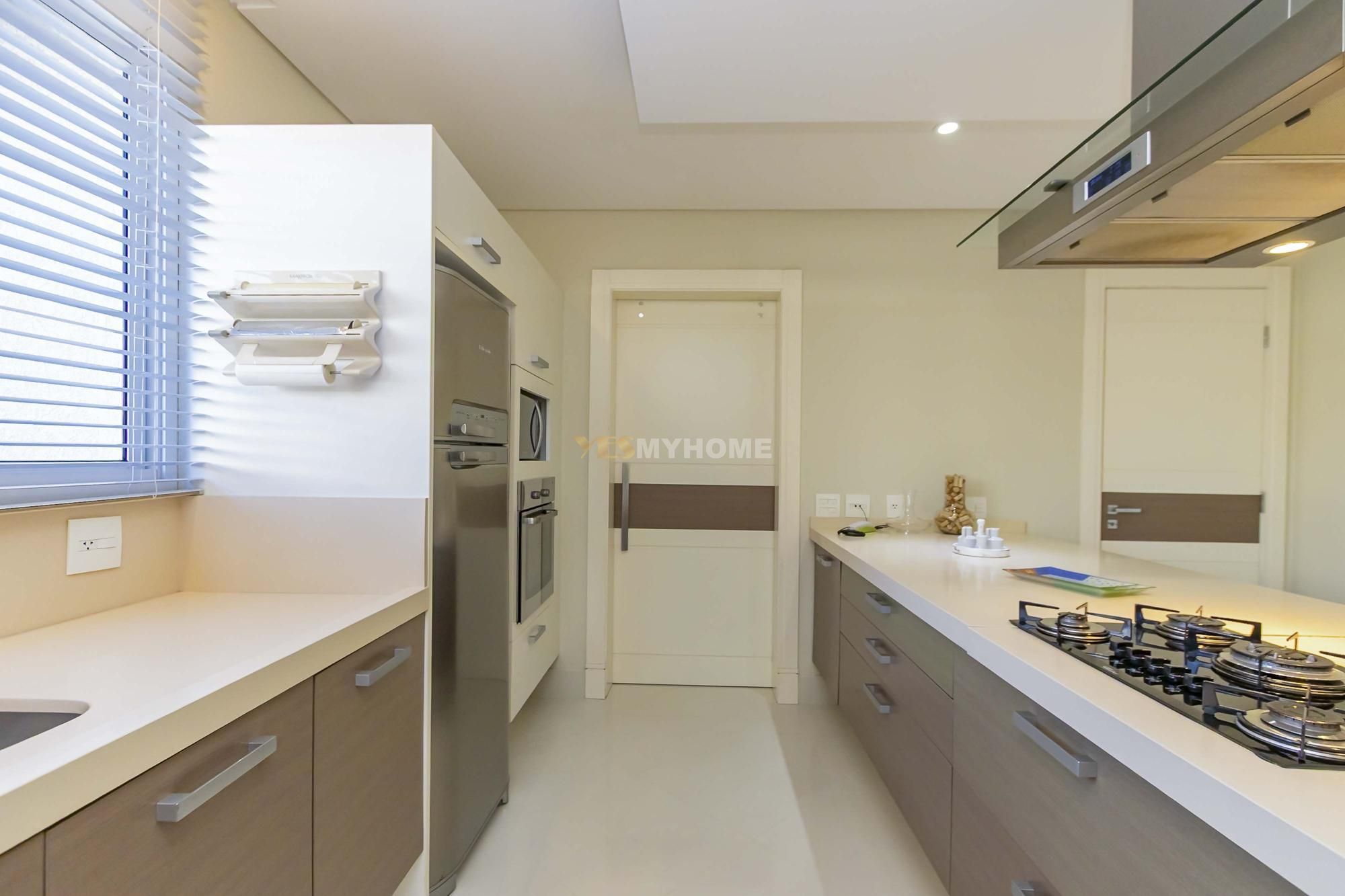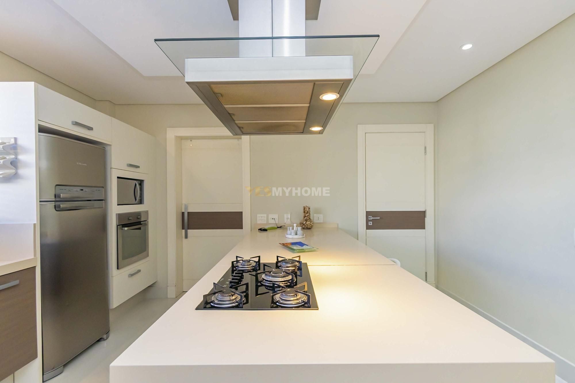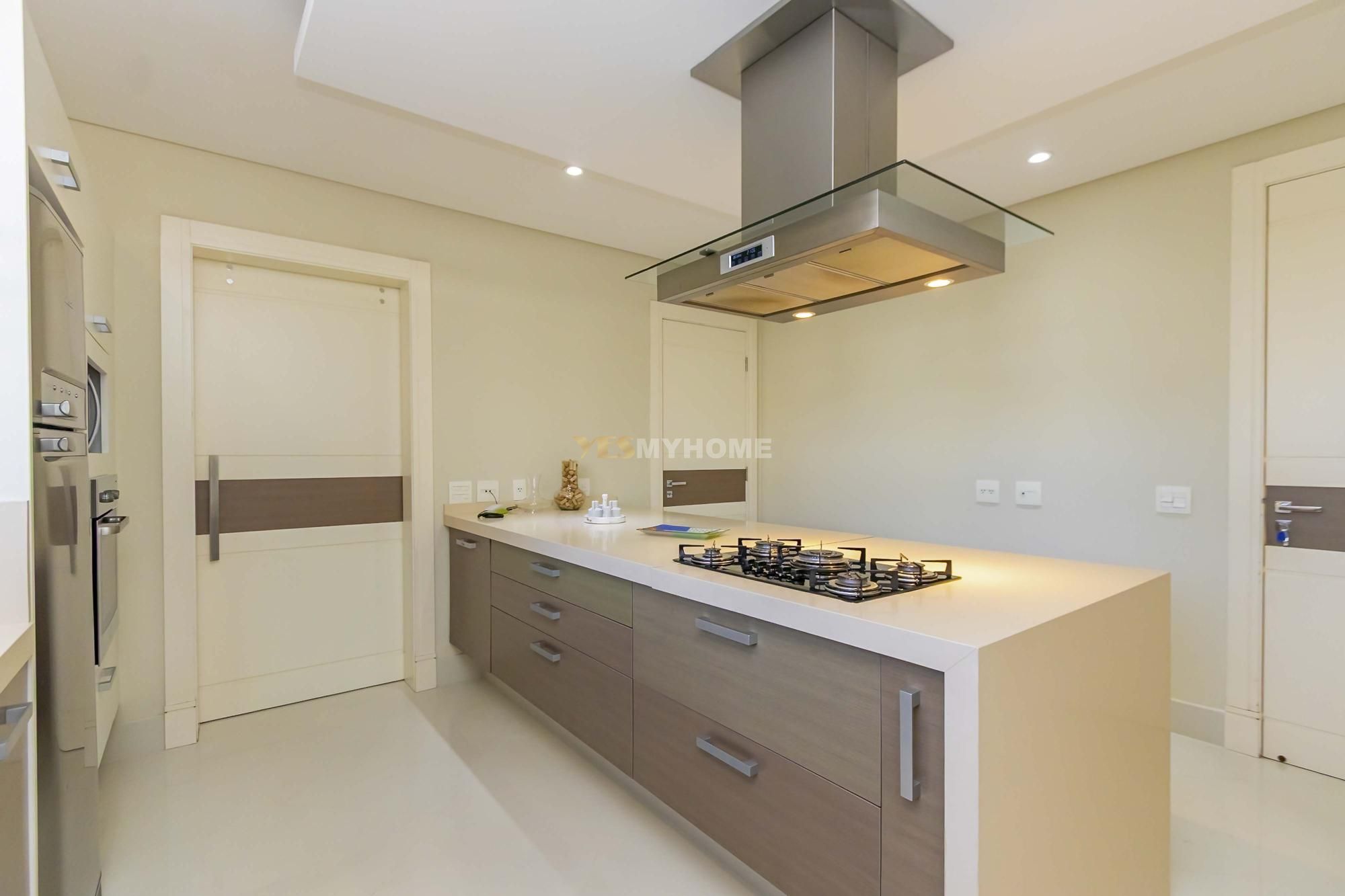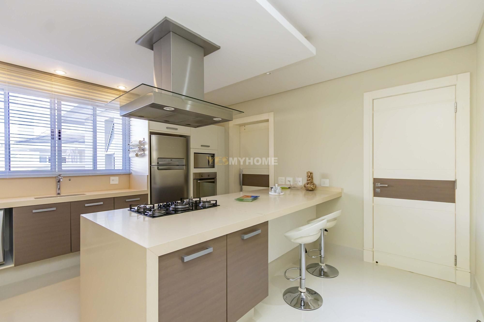 • Cozinha gourmet equipada com ilha central e despensa planejada com ilha, forno, coifa, cooktop, máquina de lavar louças