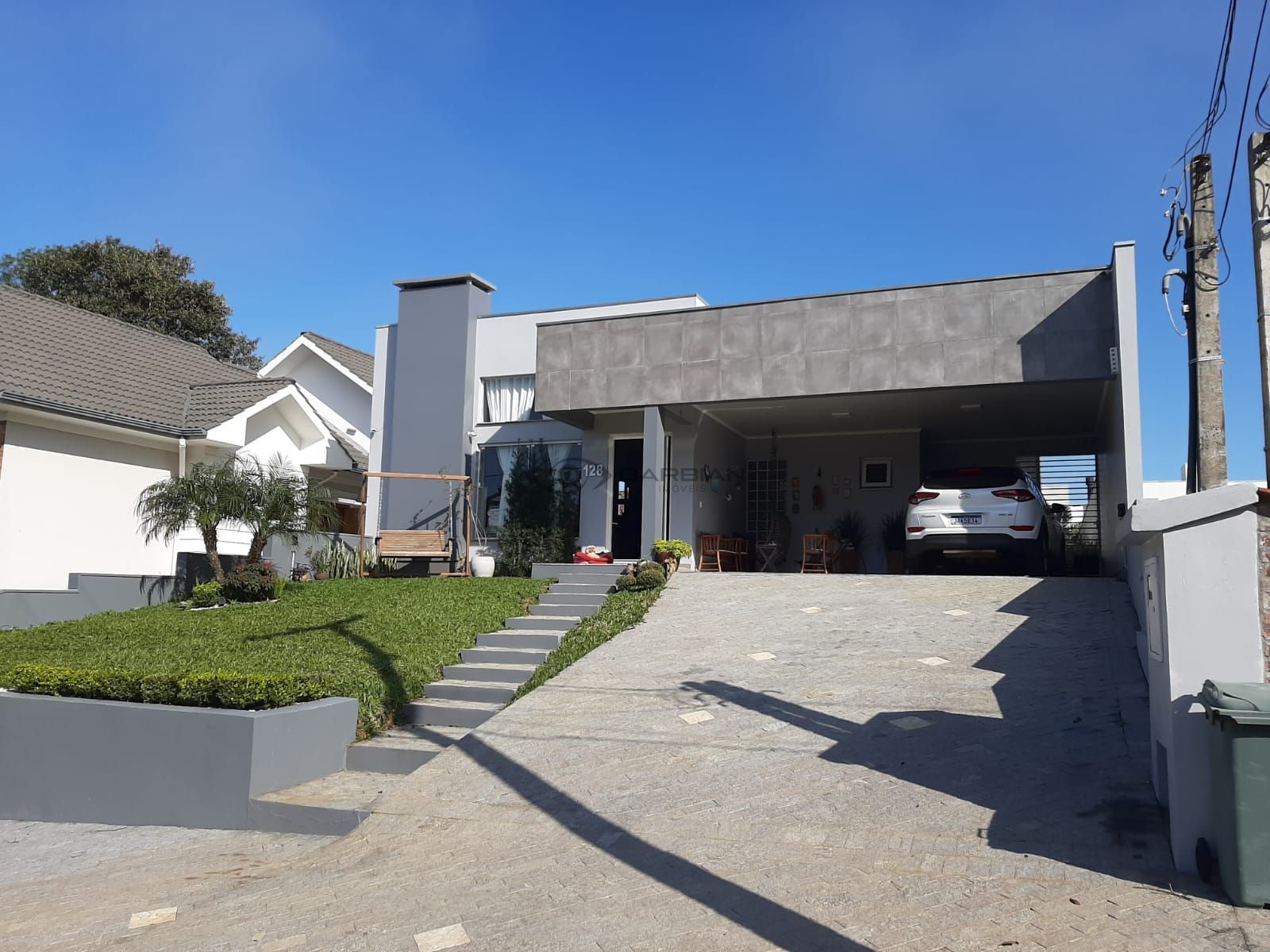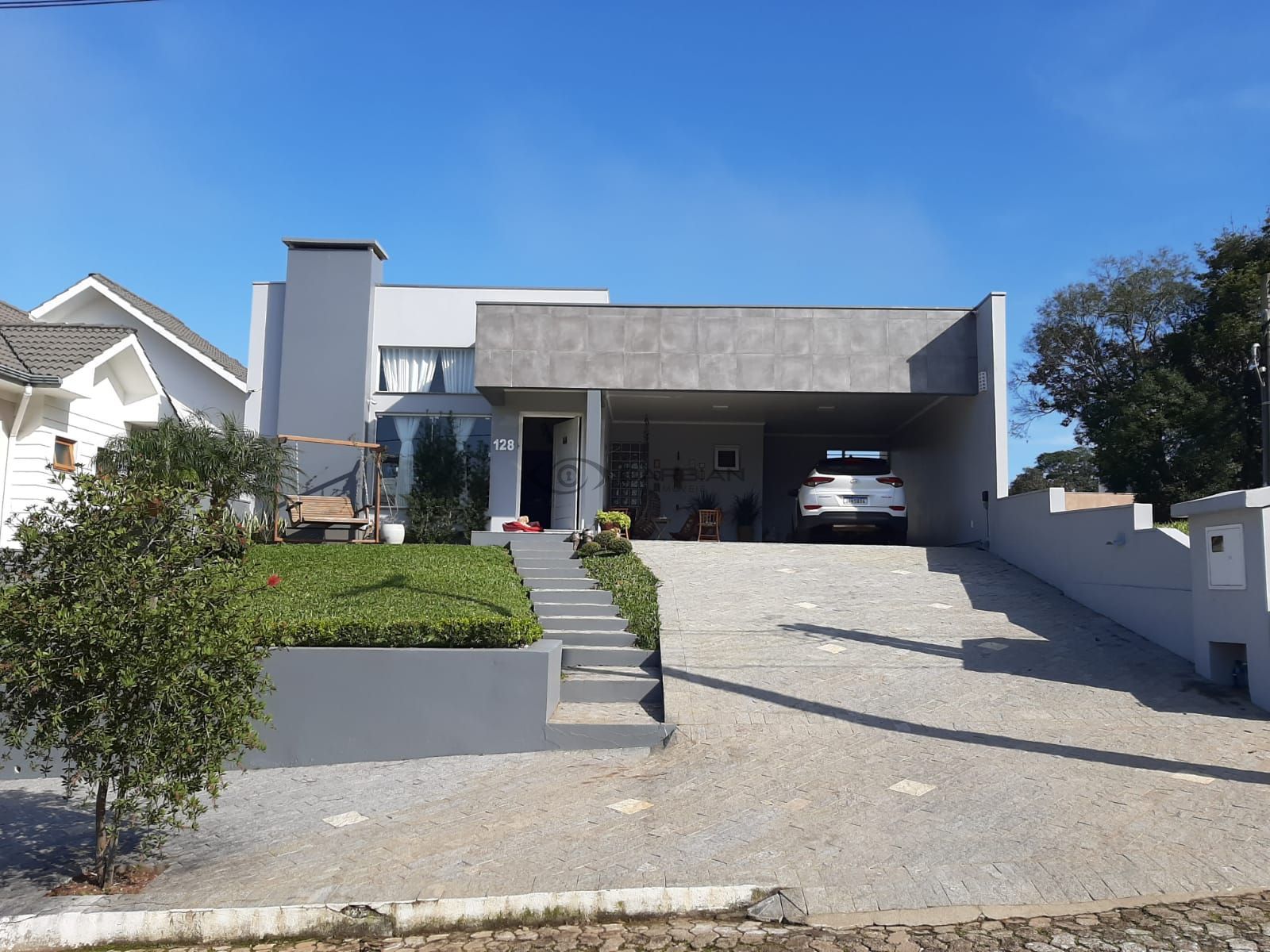 Possui 3 dormitórios (1 suíte); sala de estar/jantar com lareira; pé direito duplo; cozinha integrada; área de serviço; lavabo; 2 banheiros sociais; jardim de inverno; quiosque rústico com churrasqueira; piscina com aquecimento