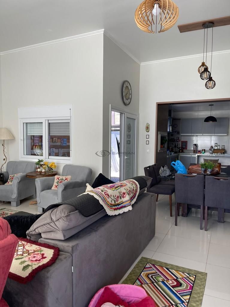 Casa a venda Santa Cruz do Sul Casa plana em condomínio fechado. Possui 3 dormitórios (1 suíte); sala de estar/jantar com lareira; pé direito duplo; cozinha integrada; área de serviço; lavabo; 2 banheiros sociais; jardim de inverno; quiosque rústico com churrasqueira; piscina com aquecimento Permanecem todos móveis projetados.