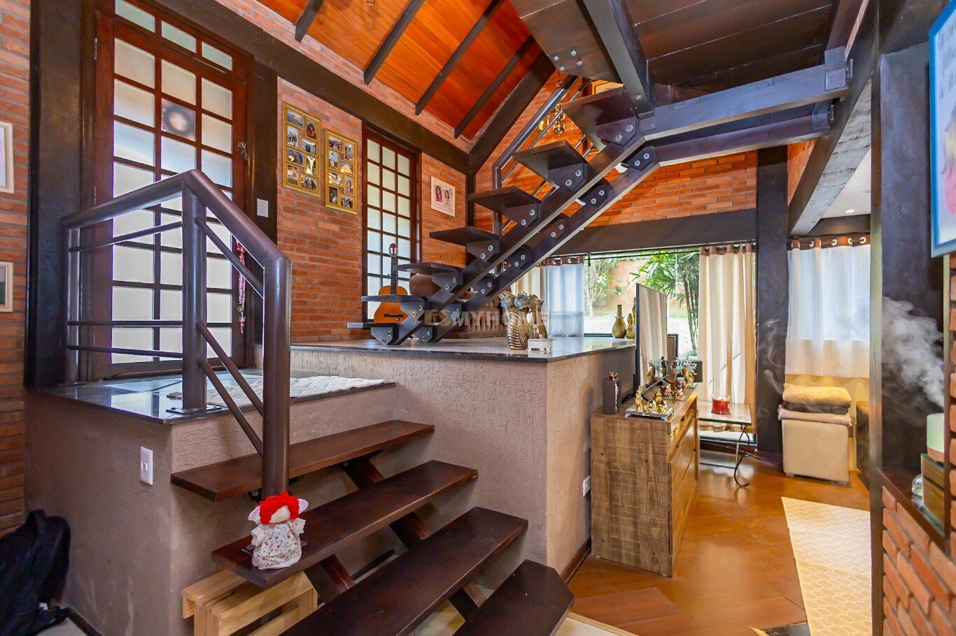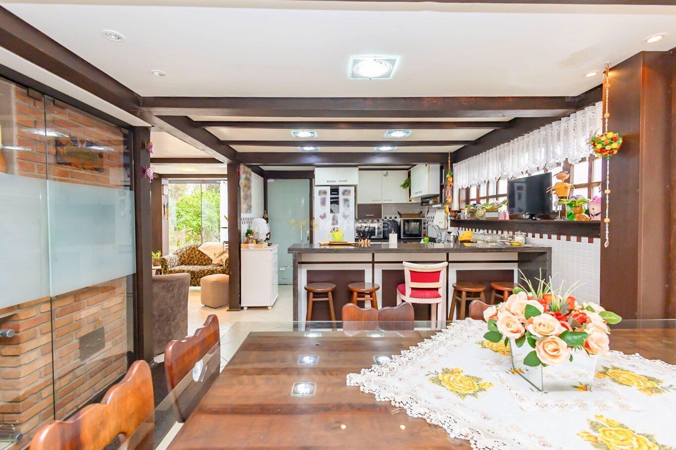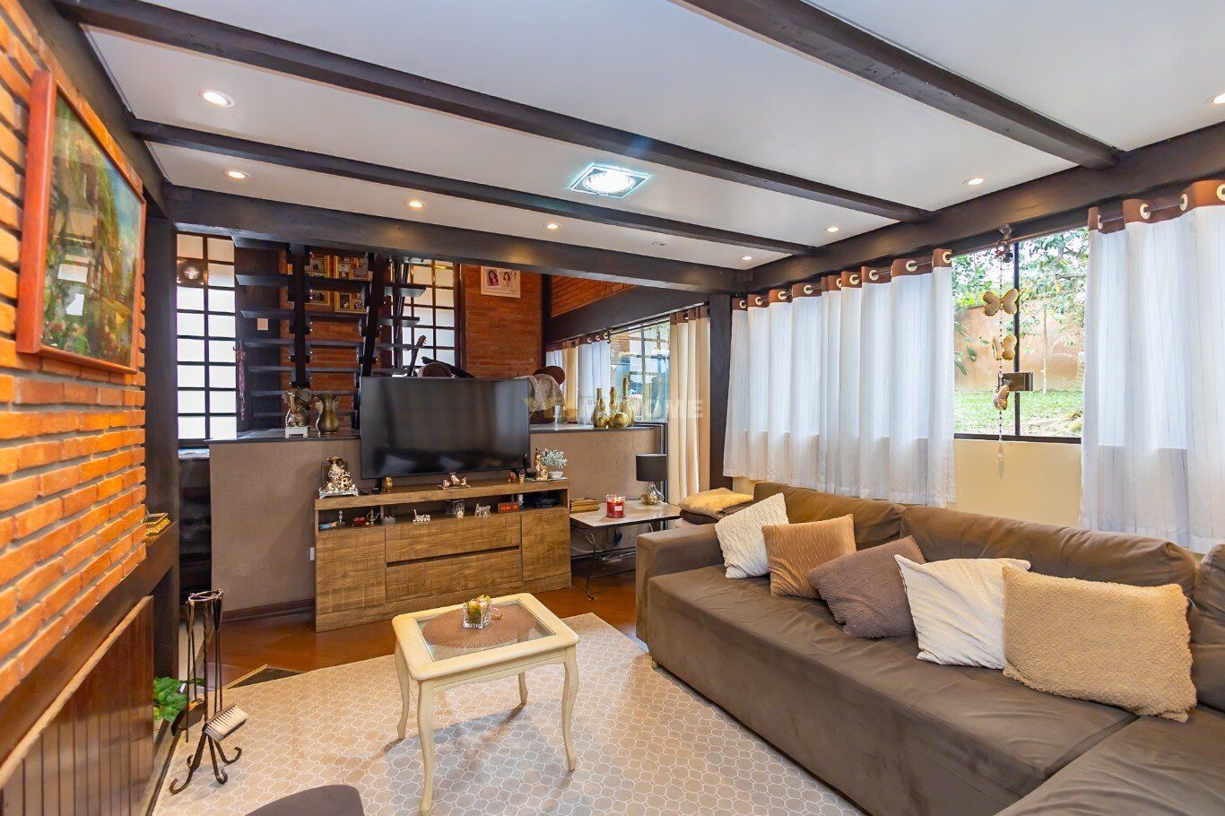 A construção impressiona com seus tijolos aparentes, vigas em madeira nobre e um telhado com inclinação acentuada. Grandes áreas envidraçadas garantem iluminação natural abundante e o pé-direito alto traz amplitude ao ambiente. A área social, perfeita para receber amigos e familiares, conta com um espaço gourmet completo, churrasqueira, forno e fogão à lenha, além de uma aconchegante lareira. Essa ilha de calor, que é o coração da casa, já foi destaque no caderno "Viver Bem" da Gazeta do Povo, em uma matéria sobre ambientes acolhedores.