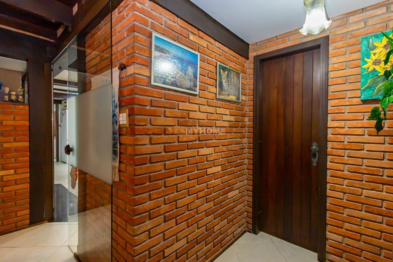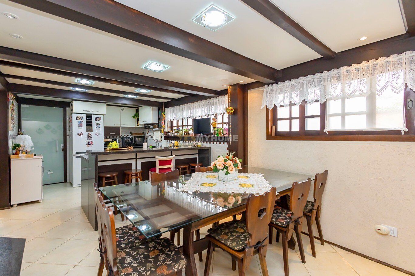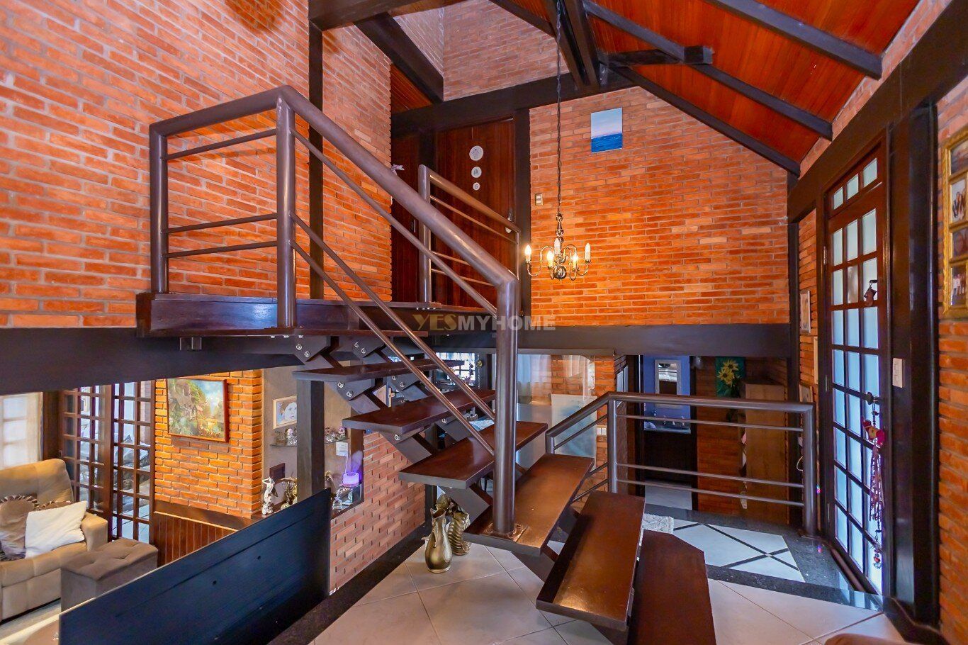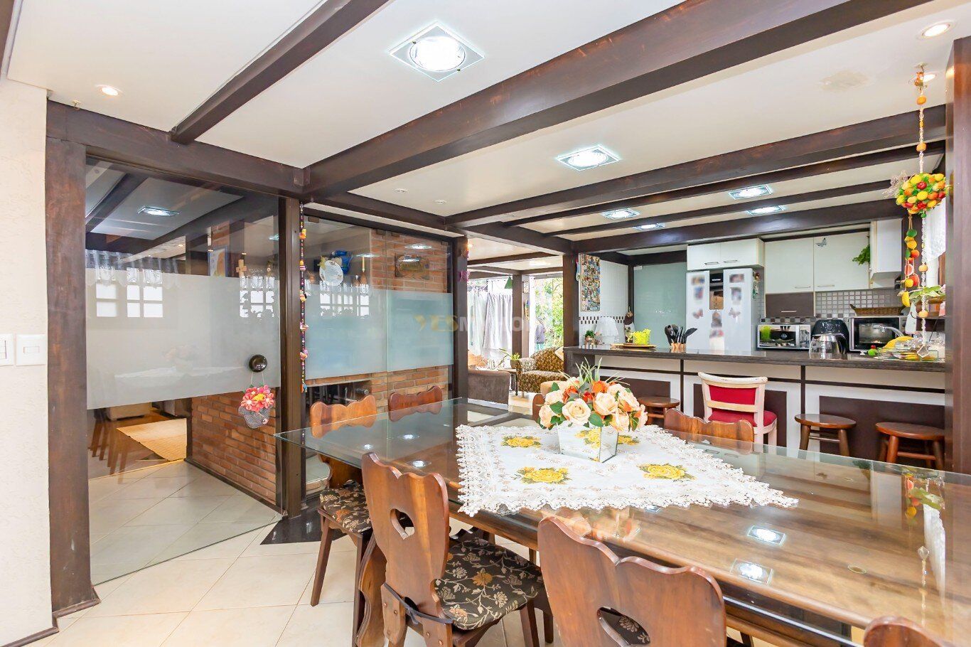 A construção impressiona com seus tijolos aparentes, vigas em madeira nobre e um telhado com inclinação acentuada. Grandes áreas envidraçadas garantem iluminação natural abundante e o pé-direito alto traz amplitude ao ambiente. A área social, perfeita para receber amigos e familiares, conta com um espaço gourmet completo, churrasqueira, forno e fogão à lenha, além de uma aconchegante lareira. Essa ilha de calor, que é o coração da casa, já foi destaque no caderno "Viver Bem" da Gazeta do Povo, em uma matéria sobre ambientes acolhedores.