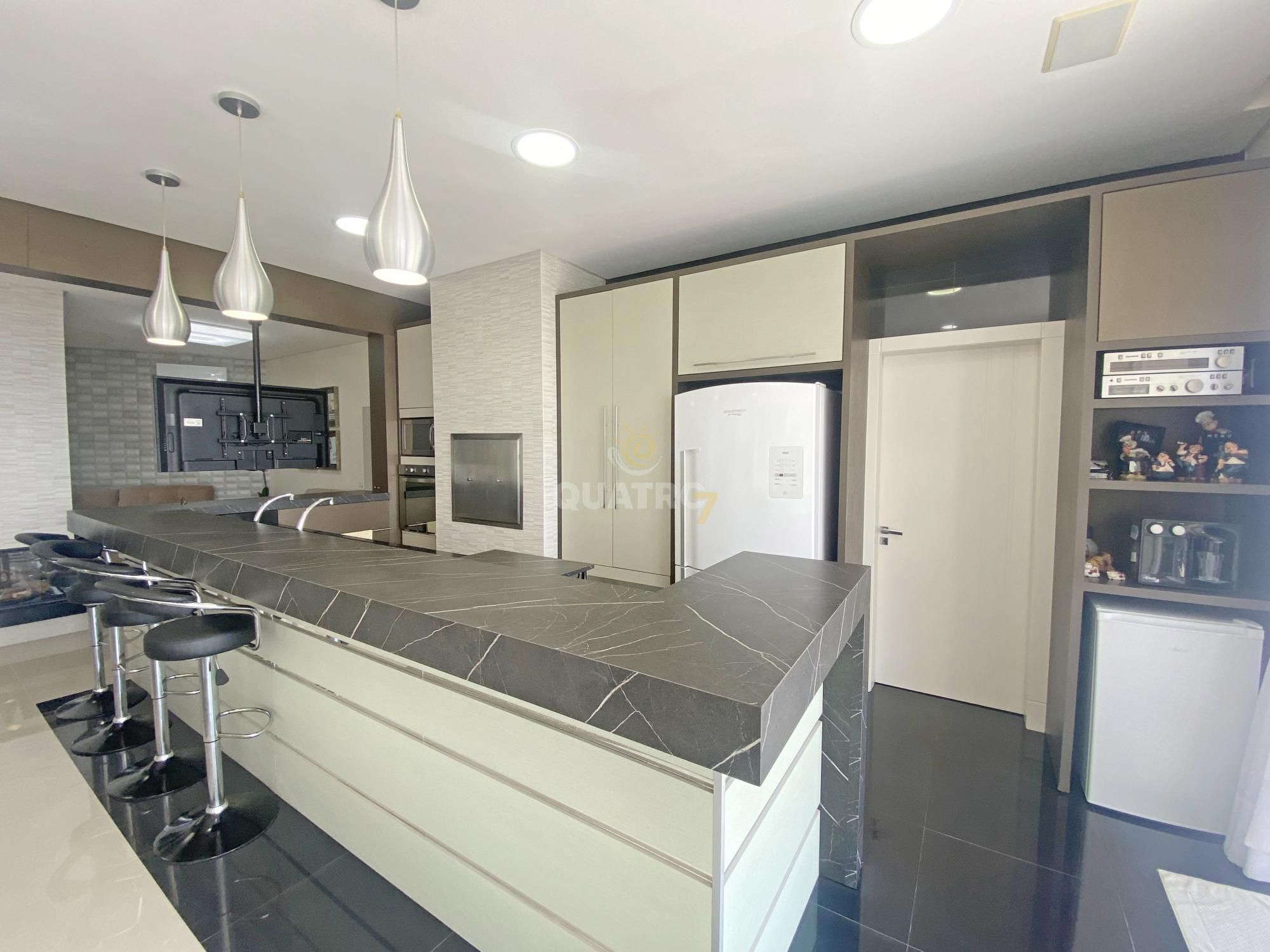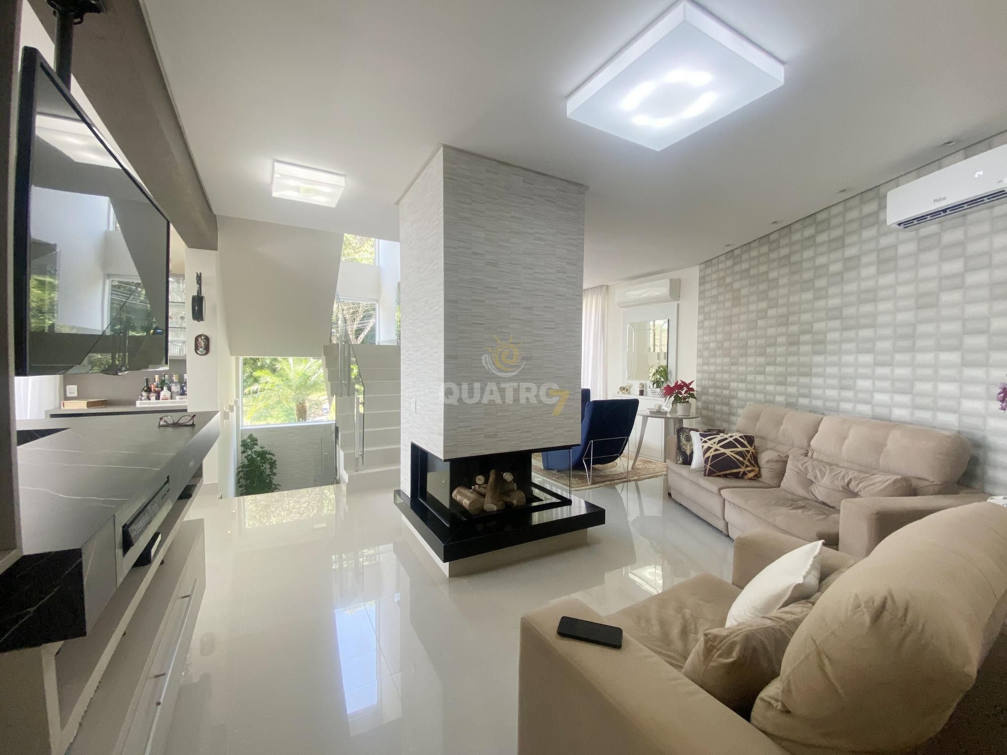 No andar inferior amplo espaço gourmet com cozinha, espaço de jantar anexo a área de estar com lareira. Na área externa oferece piscina privativa aquecida.