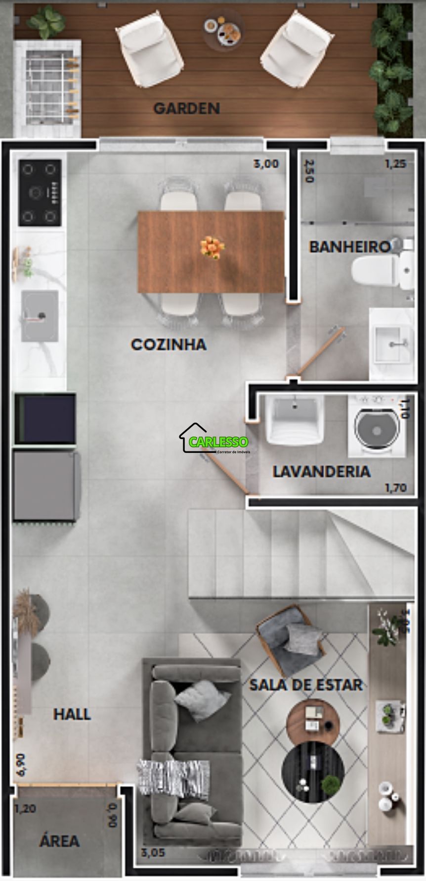 Além de espaços em conceito aberto (sala de estar e cozinha) e espaço garden com churrasqueira.