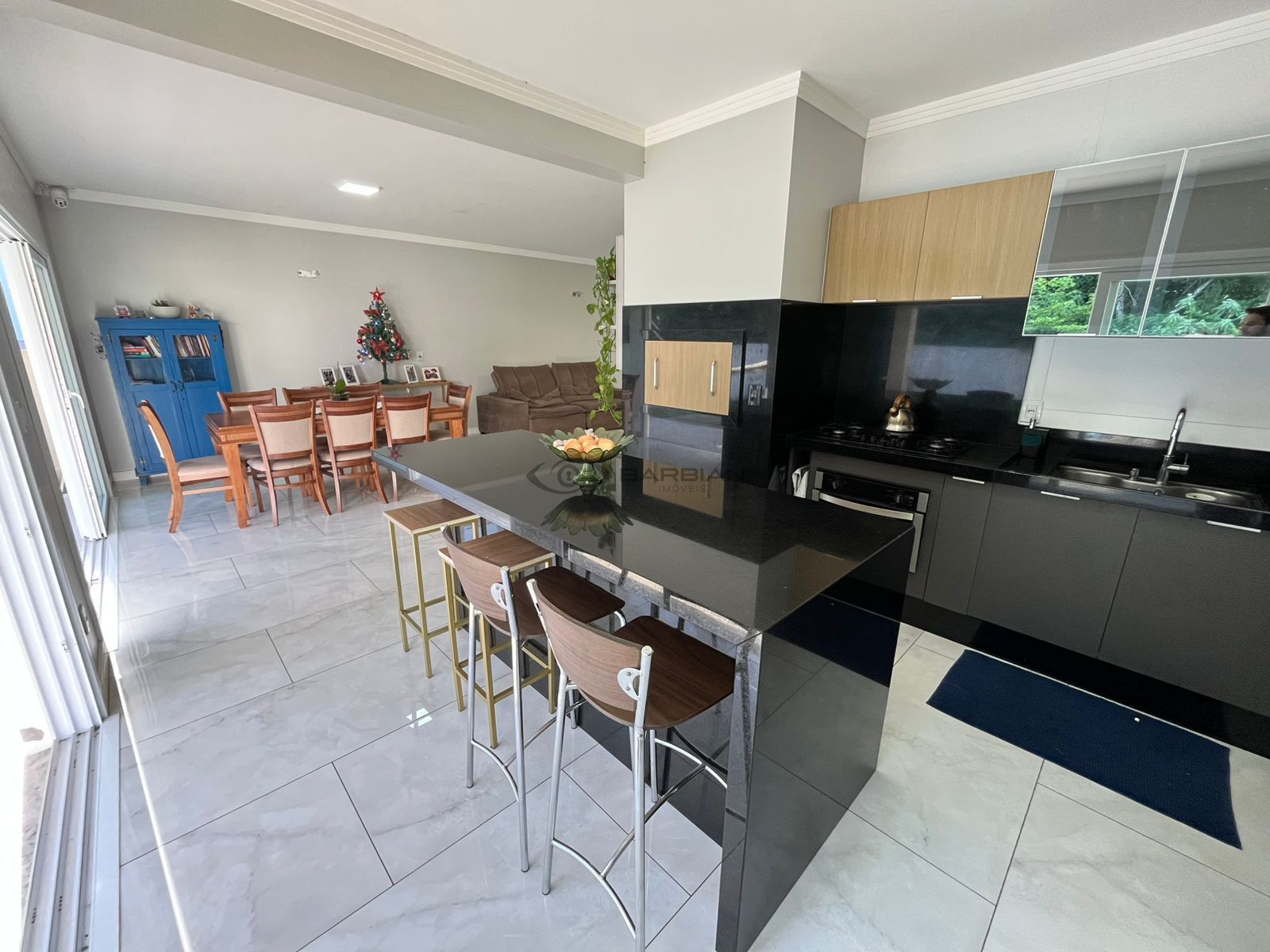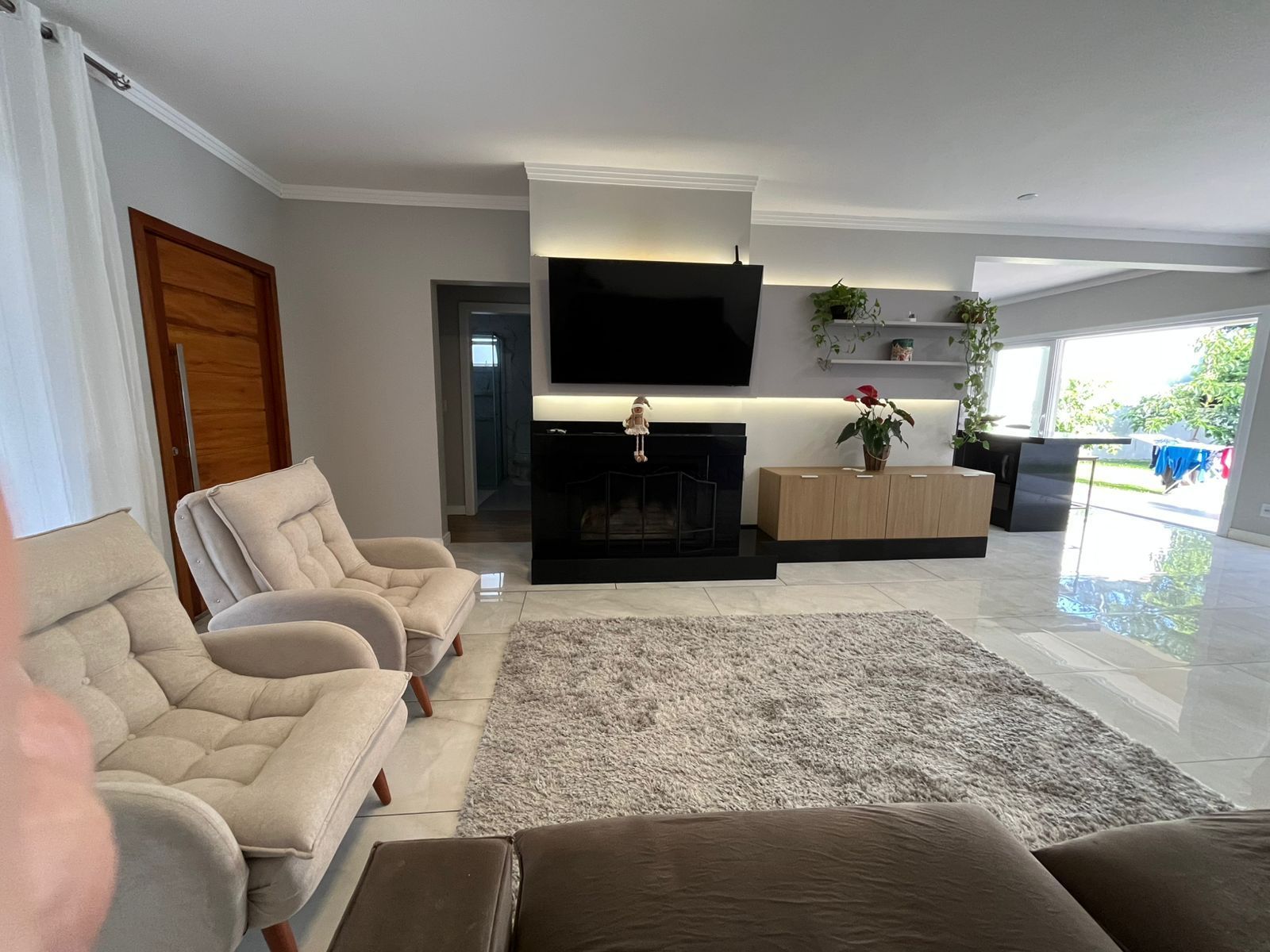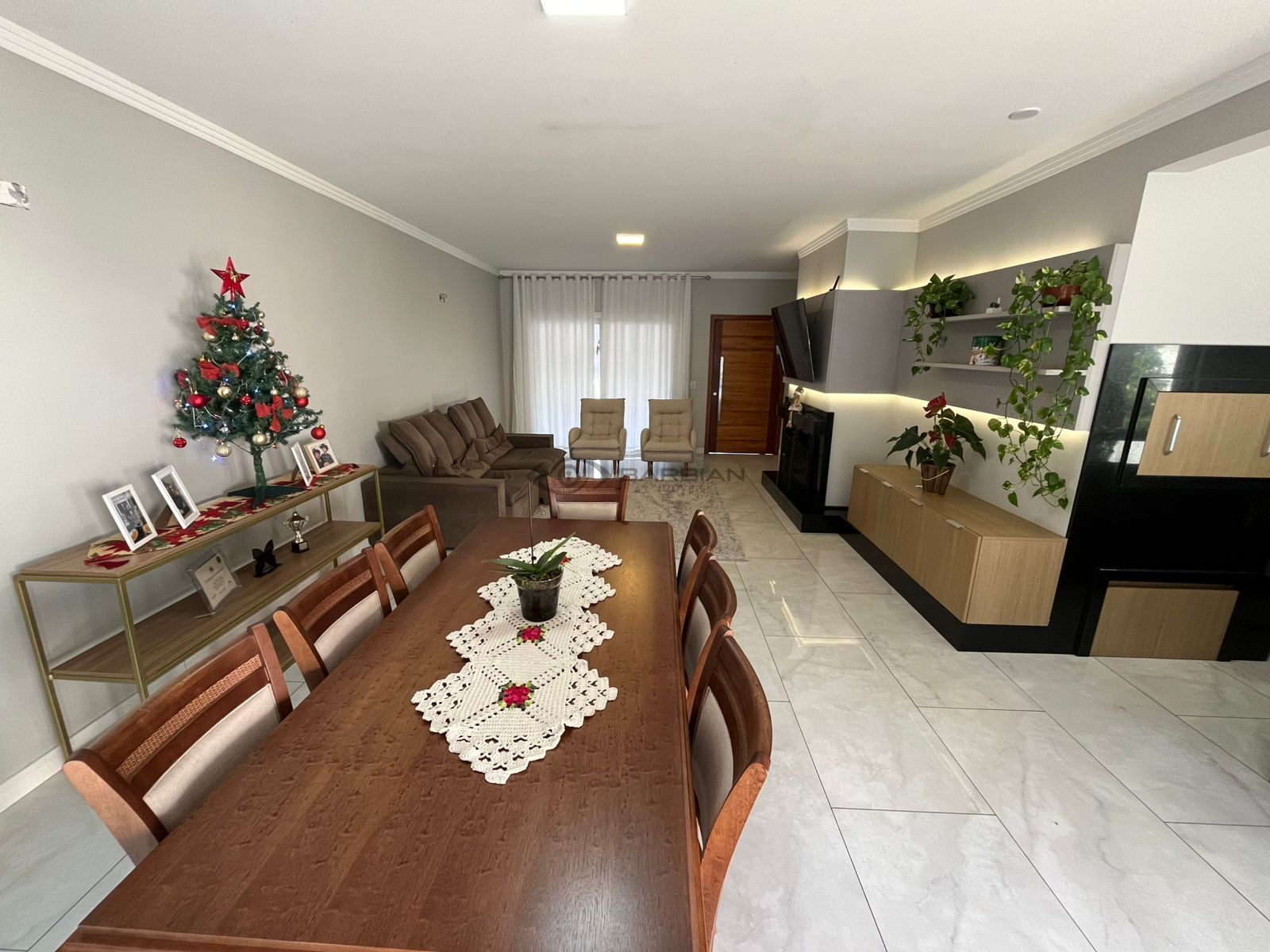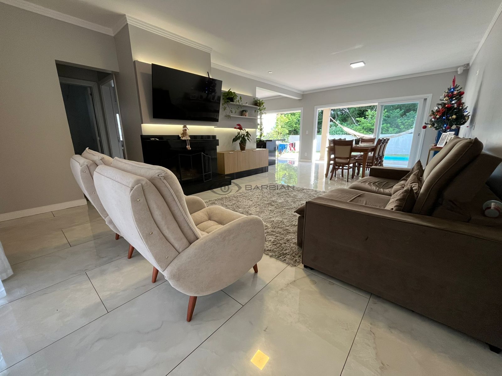 Ampla sala de estar com lareira, integrada com jantar, churrasqueira, e cozinha.