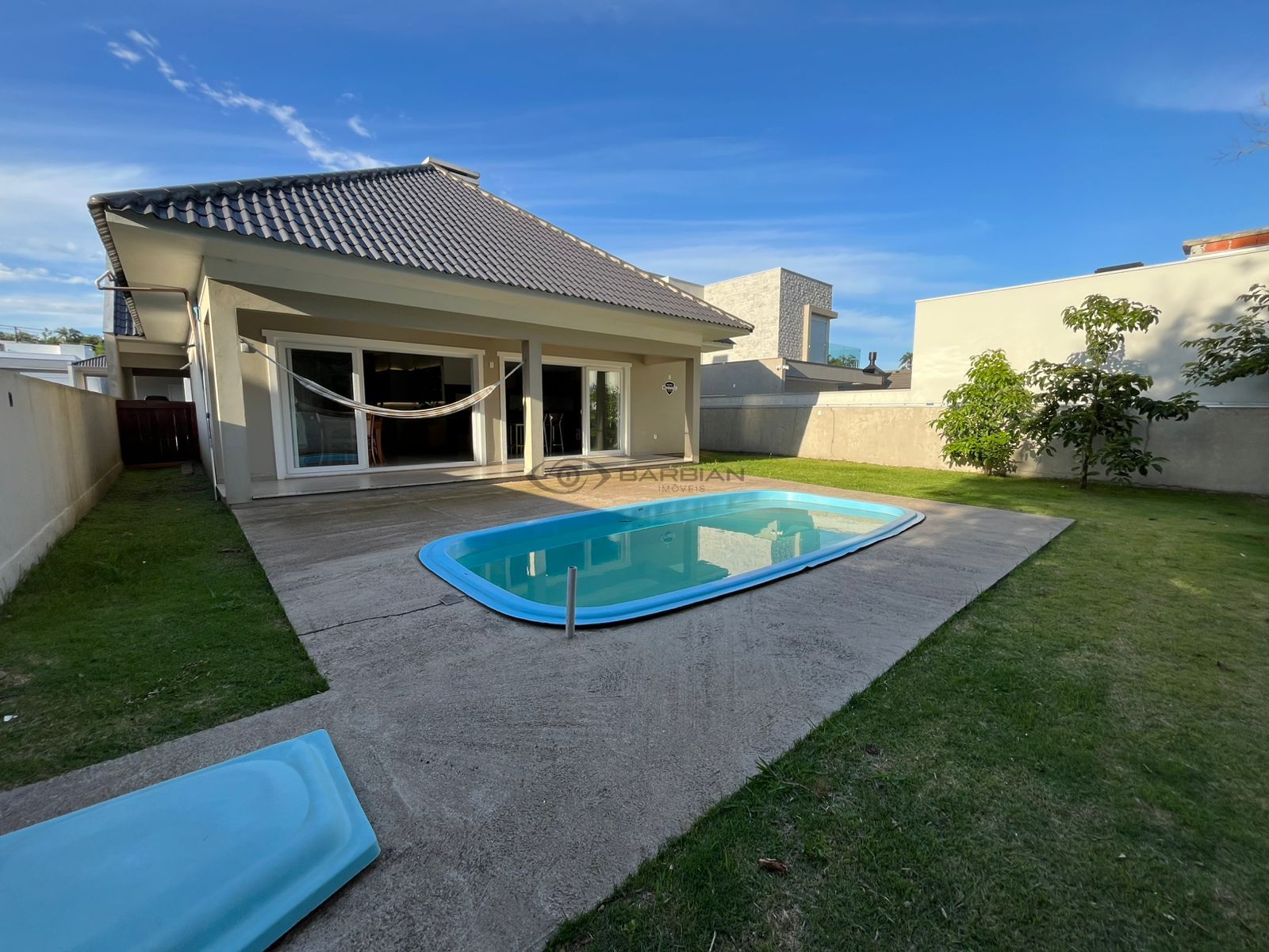 Amplo pátio, murado nas laterais e fundos, e piscina.