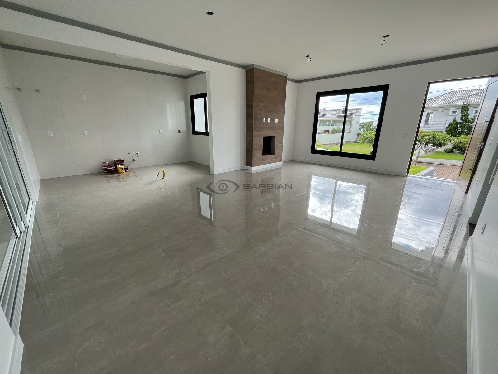 Sendo sala de estar com lareira, sala de jantar e cozinha integradas,