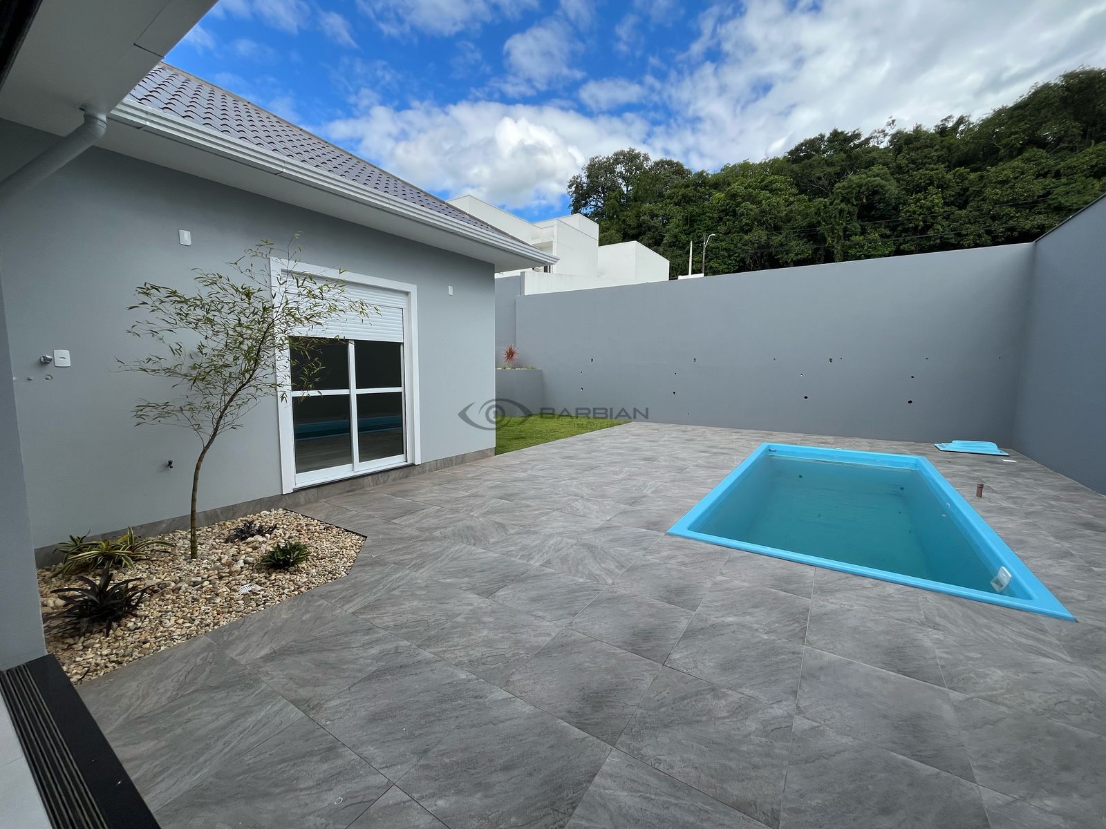 Pátio nos fundos murado e com piscina.