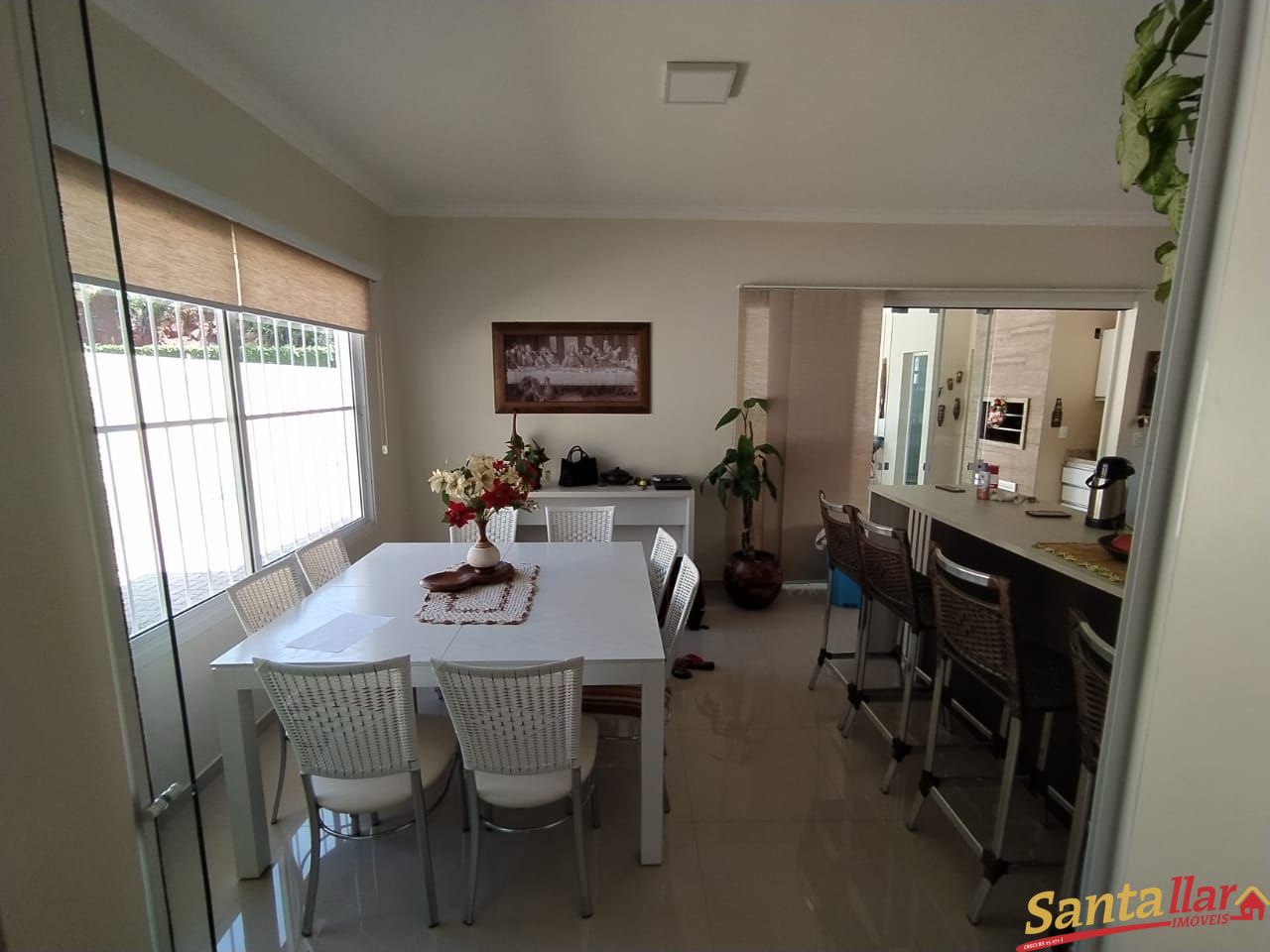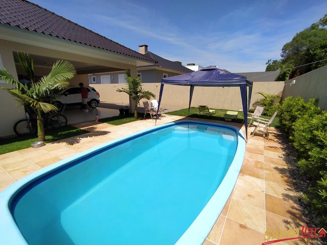 Composta por 03 dormitórios, sendo 01 suíte com closet, 03 banheiros, sala de estar, sala de tv com lareira, sala de jantar integrada com cozinha, amplo espaço gourmet com churrasqueira, garagem para 02 carros, jardim, piscina de 08 metros de comprimento, pátio fechado com muro, cerca de vidro e portão eletrônico.