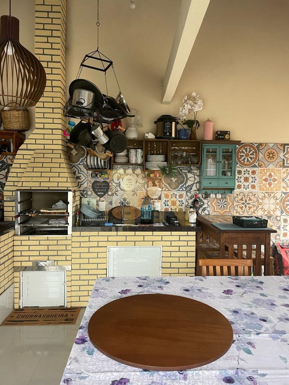 Espaço gourmet com churrasqueira e fogão a lenha