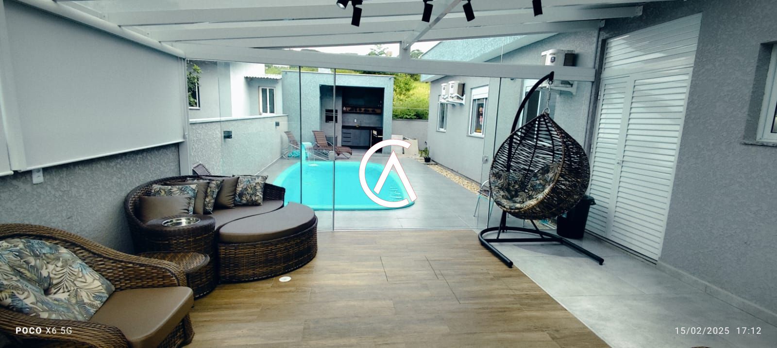 Pergolado (25m) em Alumínio, Vidro Temperado e Policarbonato Compacto, com Balanço, Chaise, Jogo de Sofás em Vime, Lareira Ecológica e Carrinho de Bebidas