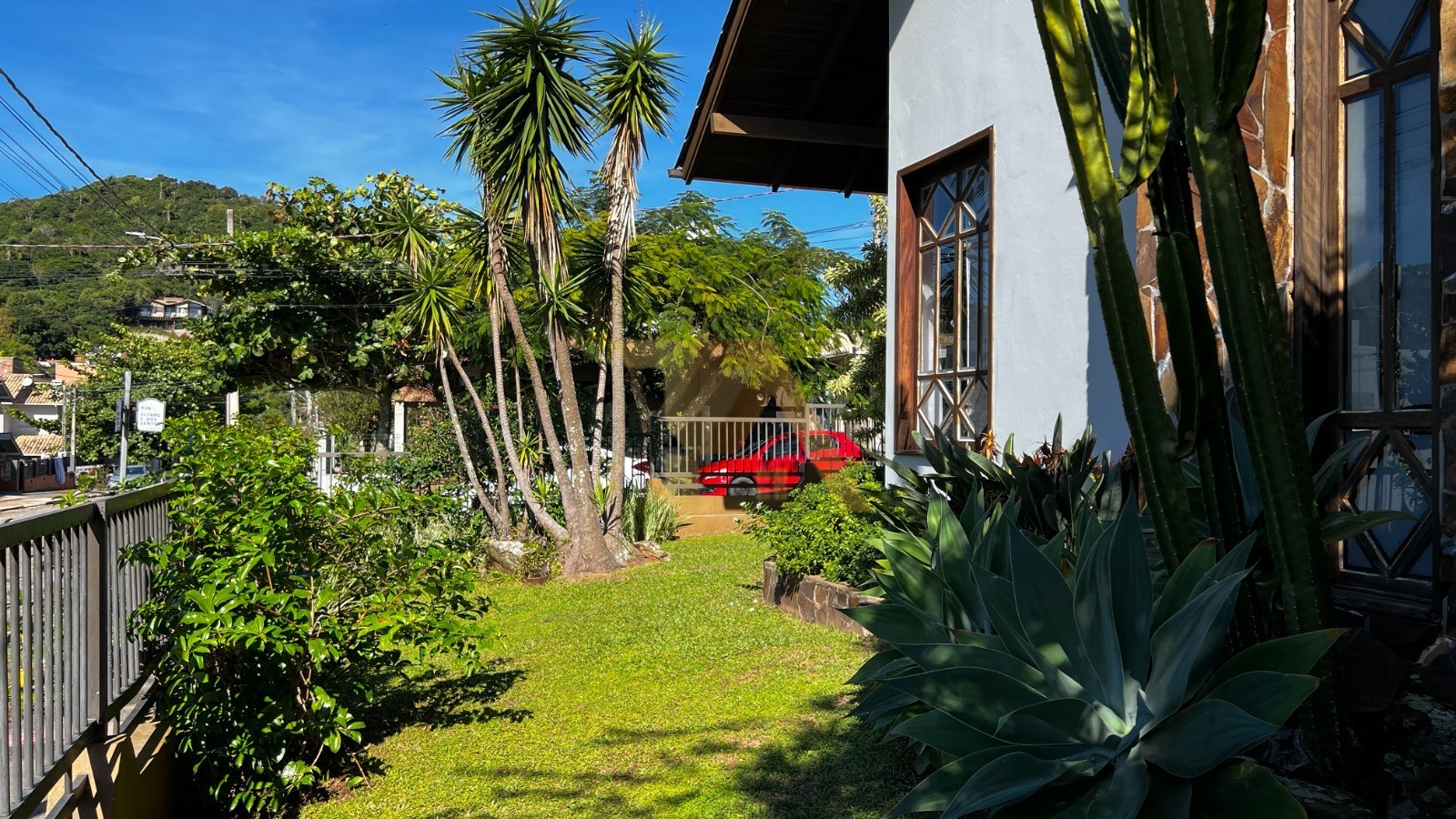 Quintal com jardim arborizado, cercado, proporcionando tranquilidade e segurança