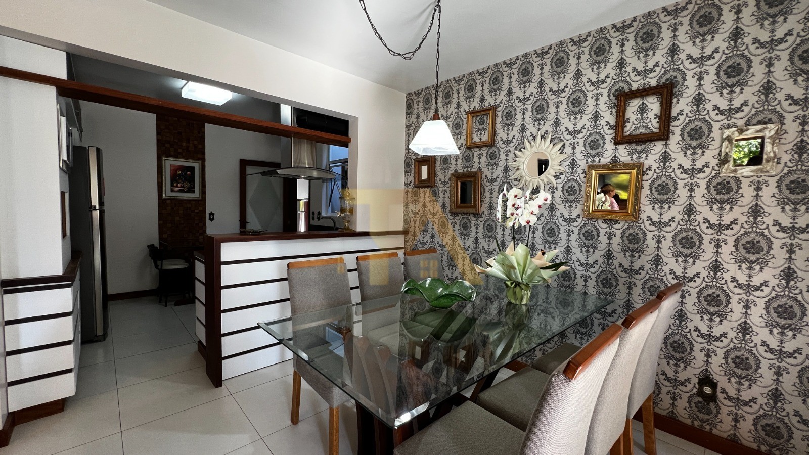 Sala de jantar ampla e iluminada