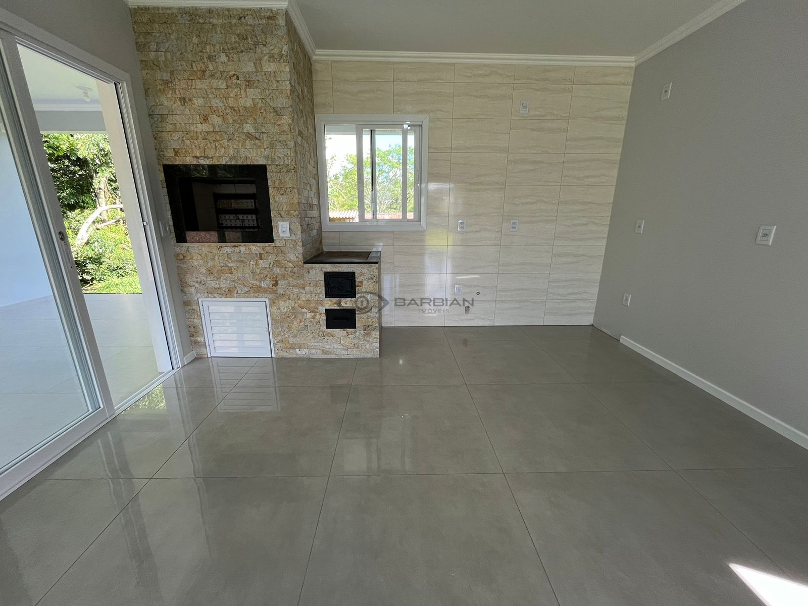 No térreo sala de estar e cozinha integradas, churrasqueira e fogão campeiro.