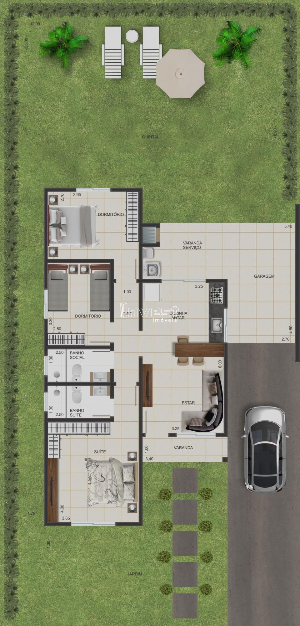 99,71m² de area útil, distribuídos por 3 dormitórios,(sendo uma suíte) sala e cozinha integrados, varanda com churrasqueira, garagem, pátio com espaço para piscina e quiosque.