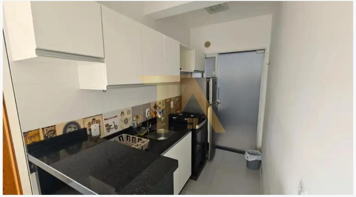 O imóvel conta com um amplo dormitório mobiliado, equipado com cama de casal, cabeceira estofada, guarda-roupas, persiana blackout e ar-condicionado split. A sala é aconchegante, com sofá-cama Herval, rack e mesa com quatro bancos, integrada à cozinha completa com armários planejados, fogão e geladeira.